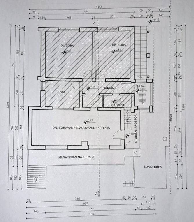 U prizemlju se nalaze 3 spavaće sobe, spremište, kuhinja, kupaonica i wc ukupne povrišine 120m2.
