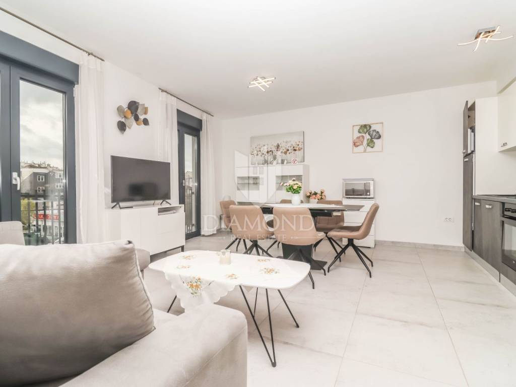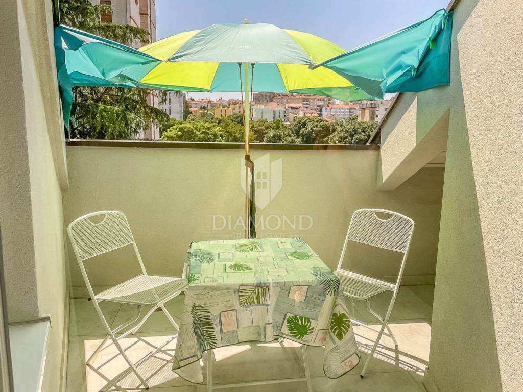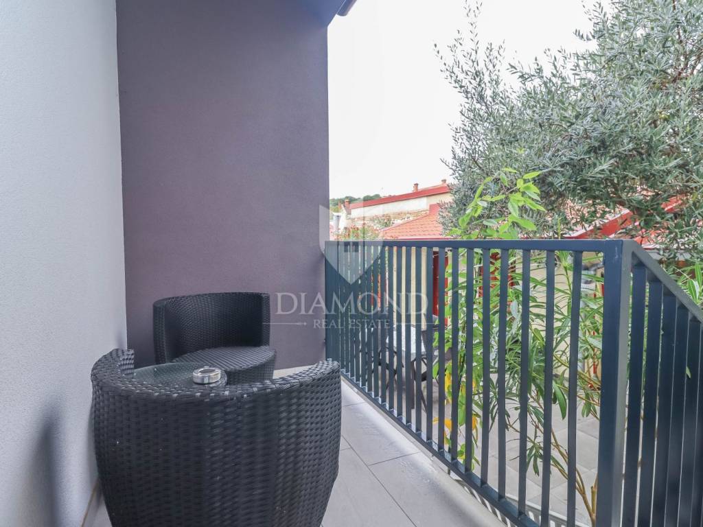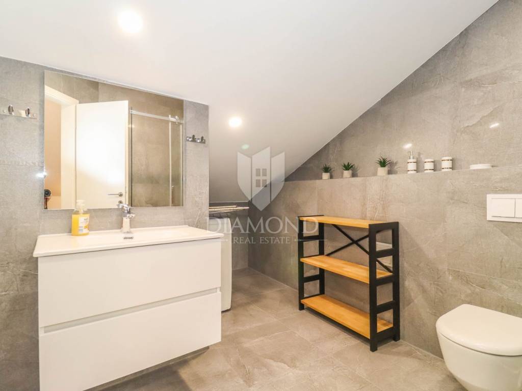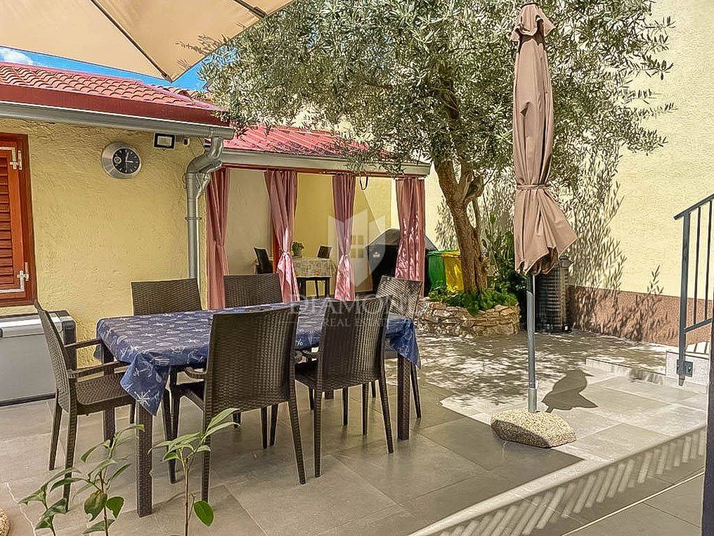 This modern three-level property consists of three fully equipped contemporary apartments and a spacious 50 m² garage with two parking spaces. The garage area also includes a technical room with a heat pump, laundry area and an extra toilet. Both the main entrance and garage lead to the internal staircase that connects all residential units. Ground floor: 55 m² apartment with a bright open-plan living area, kitchen and dining, two bedrooms (one with access to the courtyard), and a stylish bathroom with walk-in shower and underfloor heating. First floor: almost identical 56 m² layout including a balcony overlooking the garden. Second floor: charming 46 m² attic apartment featuring one bedroom, open living and dining area, kitchen, bathroom and a private roof terrace perfect for relaxing. High-quality materials and comfort were prioritized throughout: Dierre security doors, Daikin air-conditioning, aluminum windows with triple glazing and electric shutters. Each apartment has separate electricity and water meters. The units are fully furnished, tastefully decorated and ready to move in. The property is currently successfully operated as a tourist rental with proven business results and excellent guest reviews.