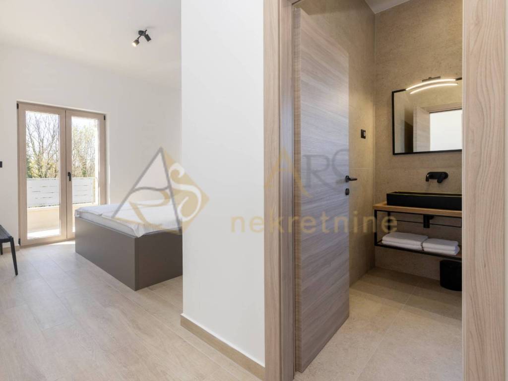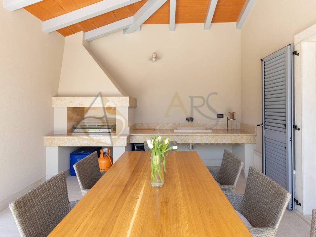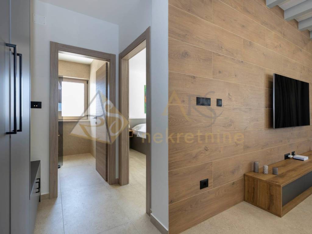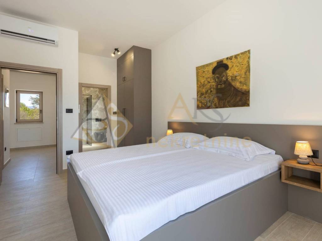 The upper floor consists of two spacious bedrooms, each with its own bathroom and access to a covered terrace with a pergola. Each room is equipped with air conditioning for year-round comfort, along with the added benefit of underfloor heating.