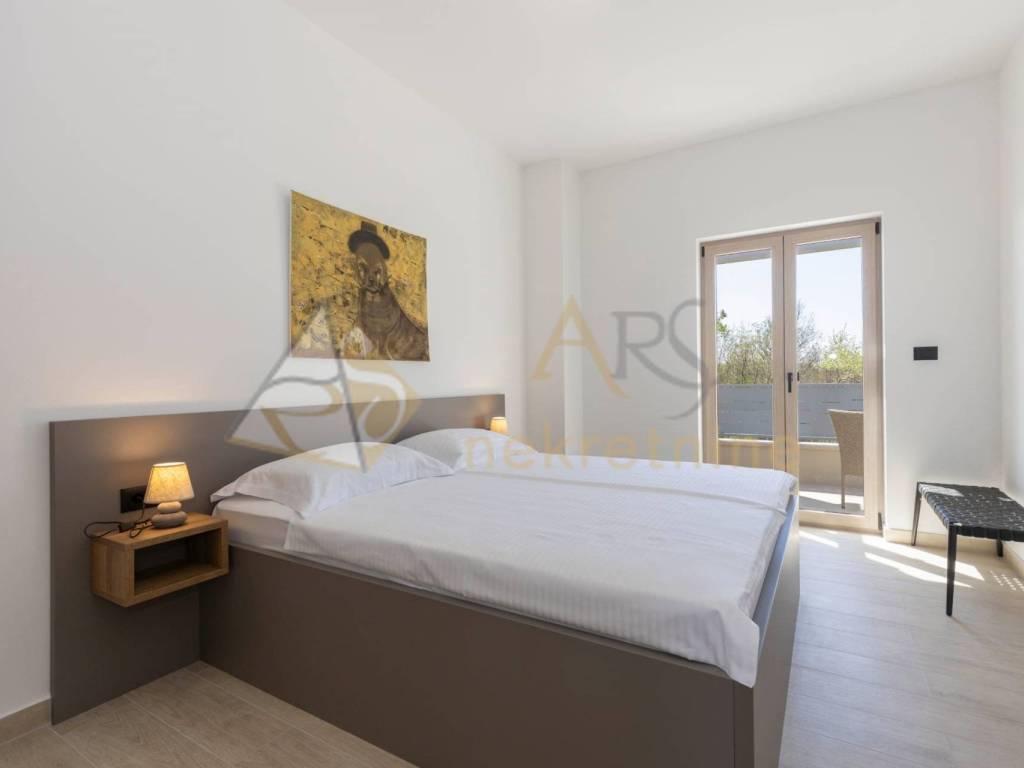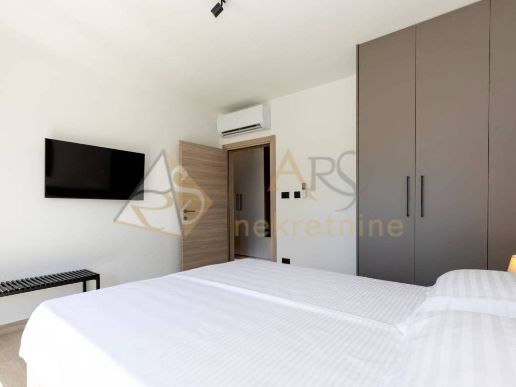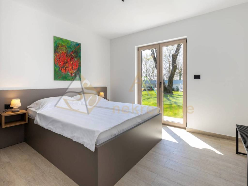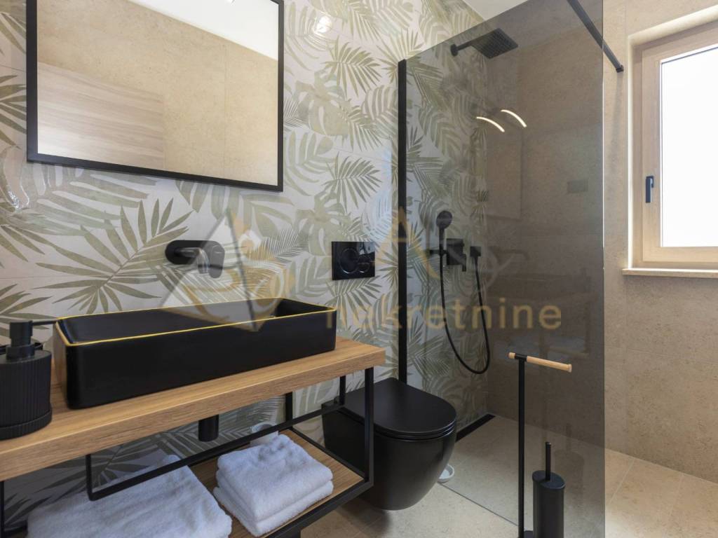 The upper floor consists of two spacious bedrooms, each with its own bathroom and access to a covered terrace with a pergola. Each room is equipped with air conditioning for year-round comfort, along with the added benefit of underfloor heating.