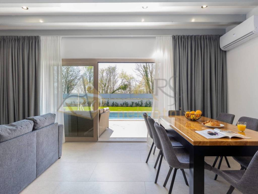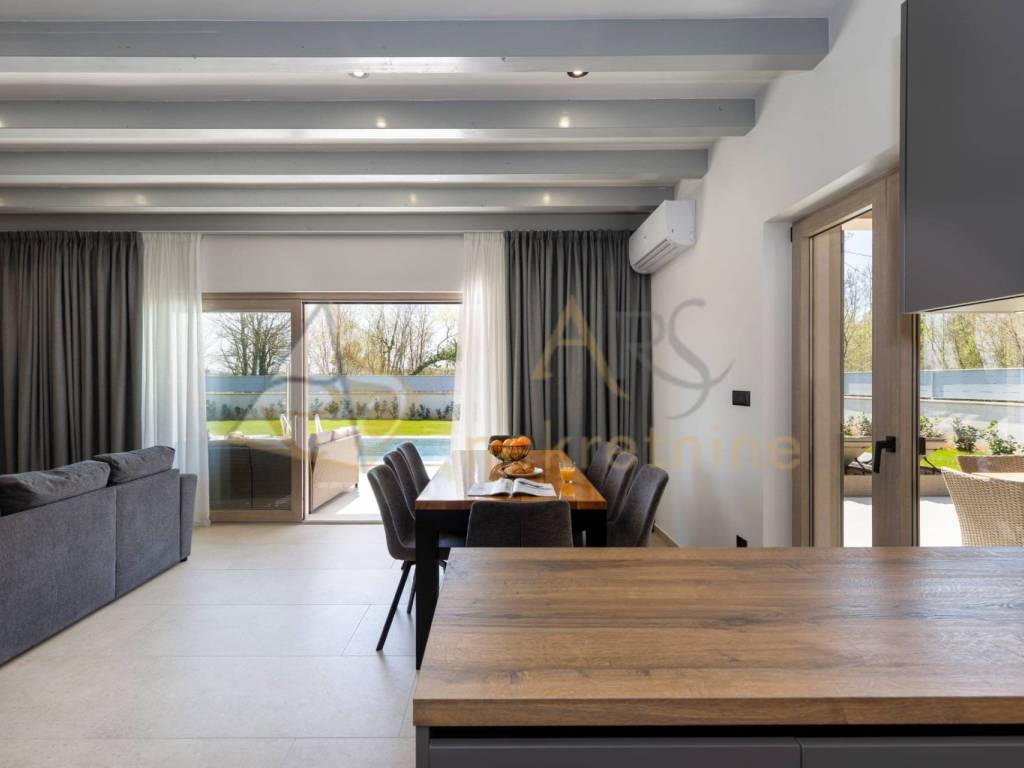 The living room provides a stunning view of the large 4 x 10 m pool, surrounded by a sunbathing area and a beautifully landscaped yard, creating an ideal space for relaxation and enjoyment during the summer months.
