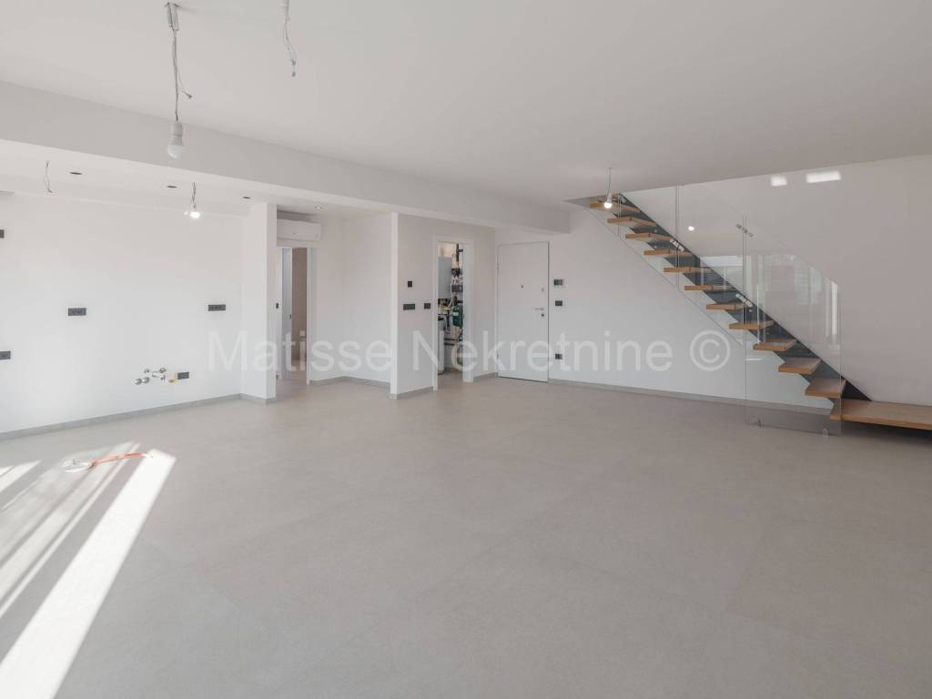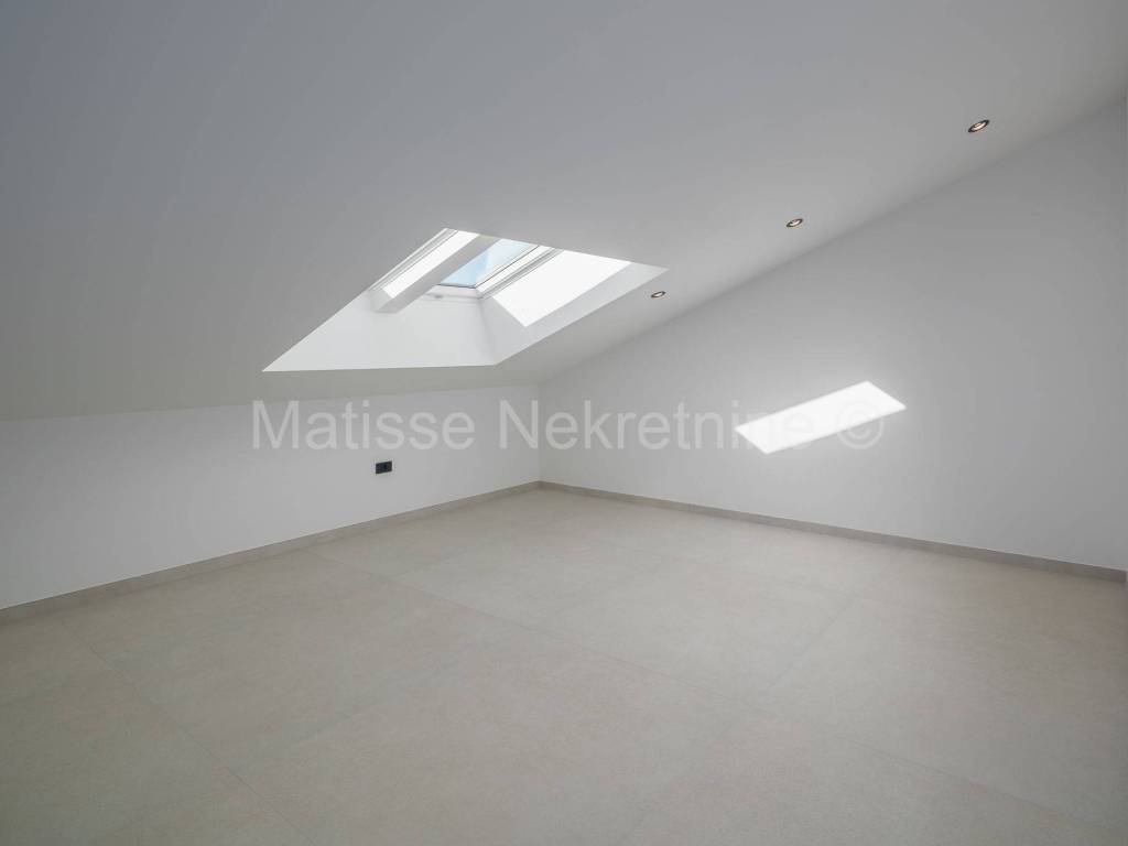 The apartment spans two floors, occupying the first floor and the attic. The spacious living room opens onto a large terrace of 25m2 with views of the sea and the old town of Rovinj. On the same floor, there are also two bedrooms, two bathrooms, and a storage room.