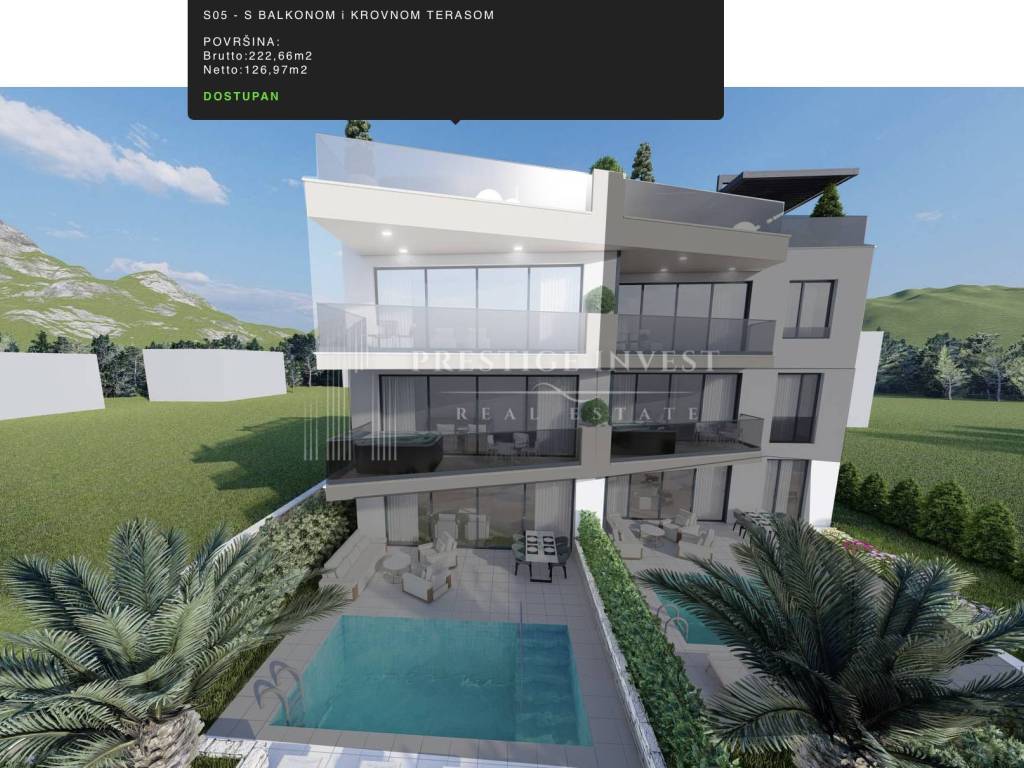 For sale is a luxurious three-bedroom penthouse located on the 2nd floor of a luxurious new building first row to the sea in Sukošan.