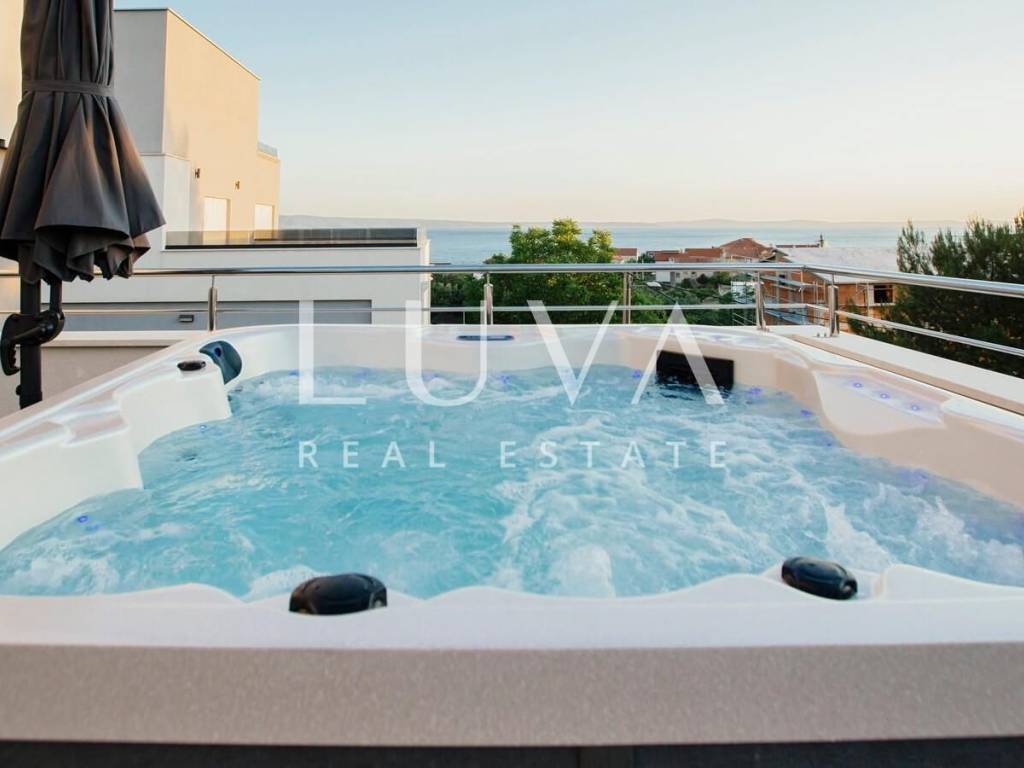 A luxury house with a pool and Jacuzzi is available for rent in Podstrana, near Split. The house is modernly furnished, fully equipped, and spread across three floors. On the ground floor, you'll find a spacious living room, kitchen, and guest toilet. The living room opens onto a large terrace with a pool and barbecue area. The first floor features three bedrooms, a bathroom, and a large terrace with a Jacuzzi. The top floor is home to the master bedroom with a private bathroom and a large terrace offering a beautiful sea view.