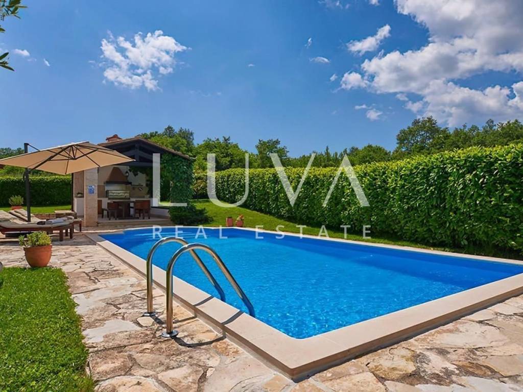 A beautiful stone villa located in Karojba, near the charming town of Motovun, is for sale. Built in 2008 for the personal needs of the owner, this house exudes quality and authentic Istrian charm. It spans two floors with a total of 202 m² of living space, while the entire property of 947 m² is fully fenced, ensuring peace and privacy.
