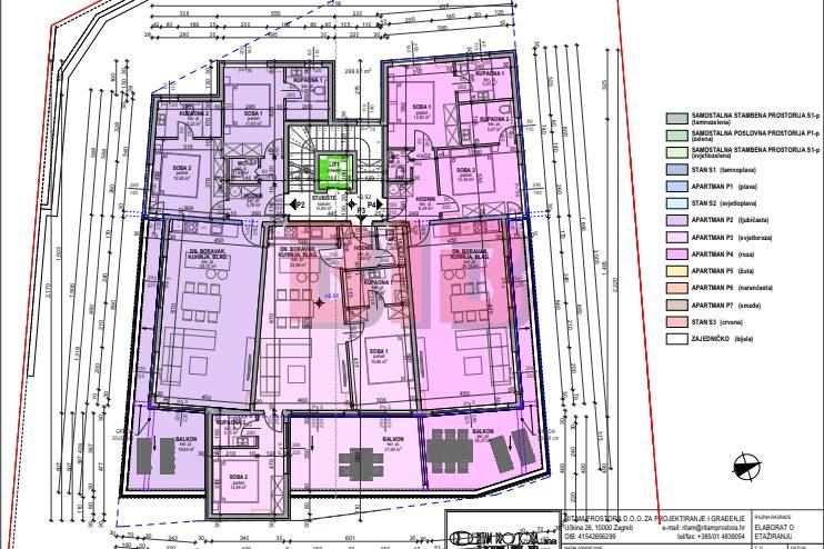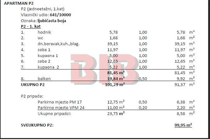 Stan se sastoji od hodnika,dvije spavaće sobe,dnevnog boravka sa kuhinjom i blagovaonicom,dvije kupaonice,wc-a,balkona,te garažnog mjesta površine 12,75m2,te parkirnog mjesta u okućnici zgrade površine 11m2.(tlocrt stana označen ljubičastom bojom)