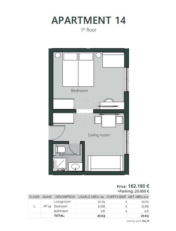 An outdoor parking space across from the building is available for purchase at the price of 20,000 EUR.