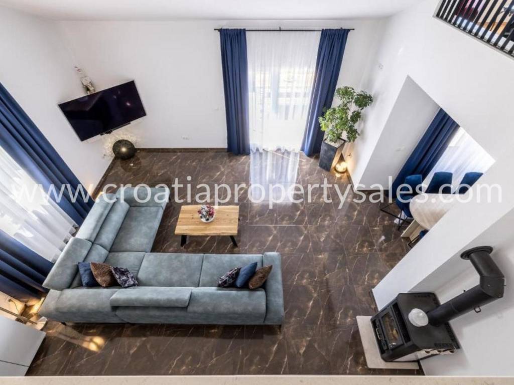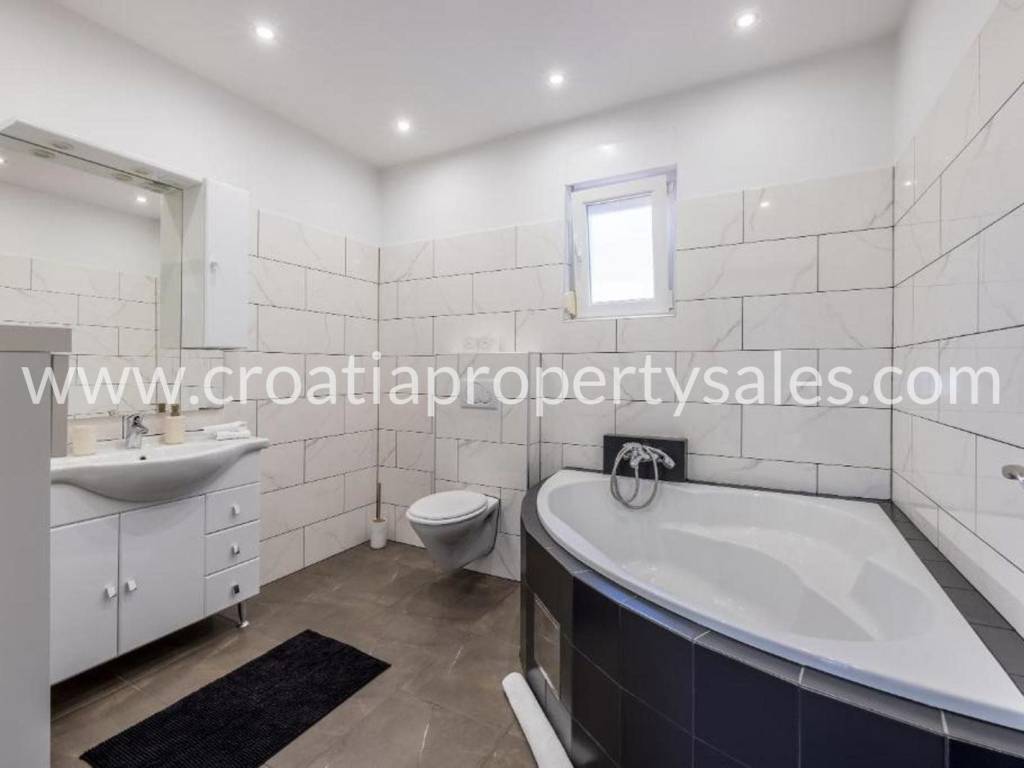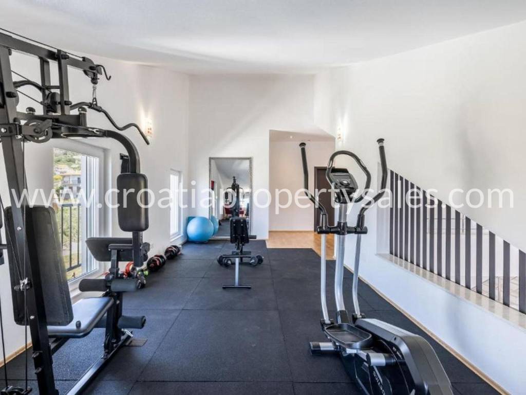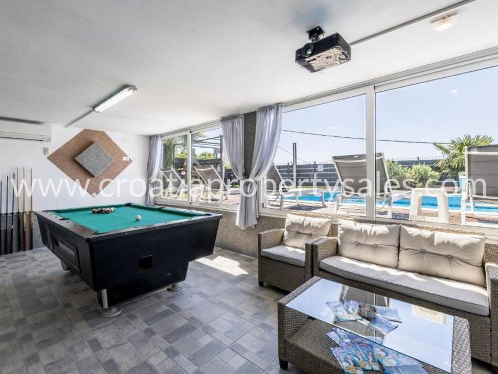 Villa with a swimming pool overlooking the sea and the Kaštela Bay.It is located on a plot of 800 m2 and has a beautifully arranged 386 m2 of living space on three levels.On the ground floor there is a swimming pool with a garden, a seating area and a barbecue.There is also a games room, an outdoor toilet and a cinema room with billiards.On the first floor there is a large living room with access to a terrace with a beautiful view of the sea and nature. The kitchen with the dining room is separated by a partition wall.On the ground floor on the north side there is one bedroom, a bathroom and a room leading to the garage and basement.Internal stairs lead to the gallery and the upper floor where there are 3 bedrooms, a bathroom on the north and a gym area on the south.On the north side of the courtyard it is possible to park 5 cars. The entire villa is fenced and offers privacy.It is located only 2 km from the center of a small beautiful town.