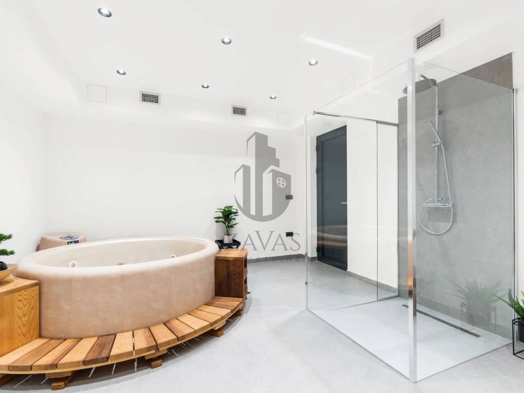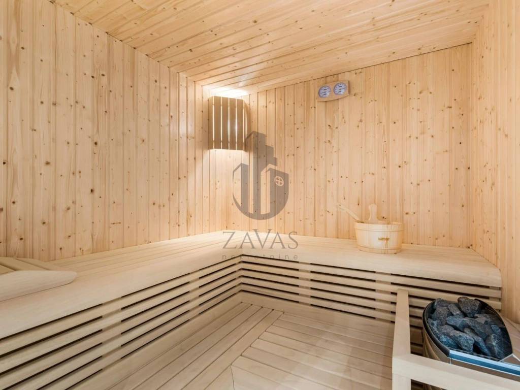 In addition to the elegant interiors, the villa includes a heated saltwater pool, sauna, jacuzzi, gym, and outdoor kitchen. The large garden provides a peaceful setting for relaxation.