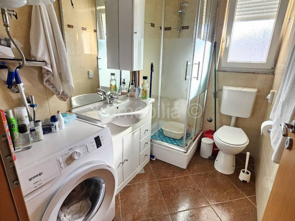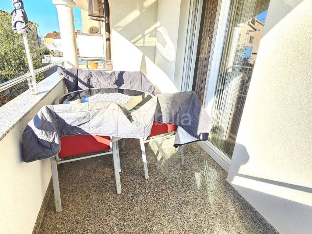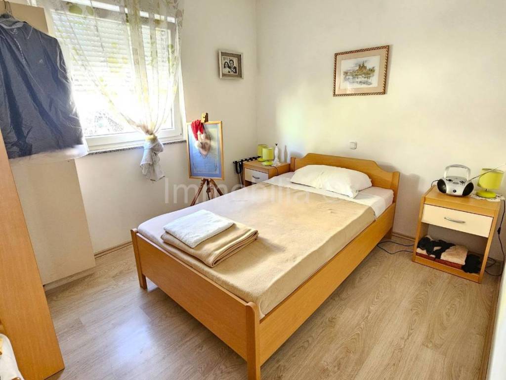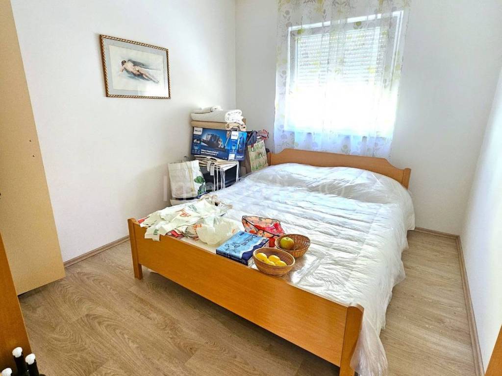 Apartman se nalazi u visokom prizemlju novije apartmantske zgrade, a sastoji se od ulaznog hodnika, 1 kupaonice, 2 spavaće sobe, dnevnog boravka, kuhinje i blagovaonice s izlazom na natkrivenu terasu.