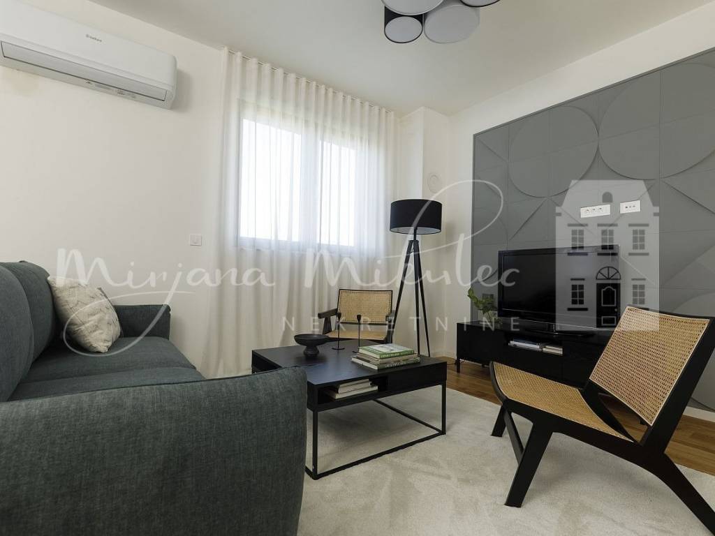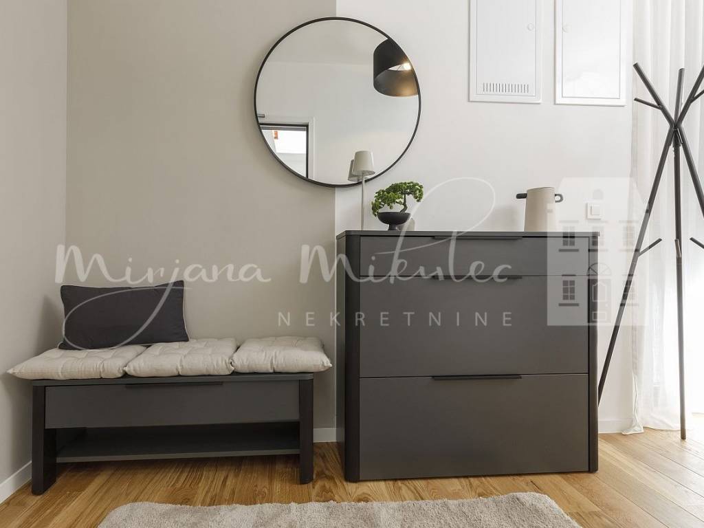 Vrhunski opremljen, potpuno uređen i namješten od Mirjana Miklulec Interior Design Studija, prekrasan stan u novogradnji s parking mjestom i garažom bruto površine 111,23 m2. Ovaj komforan stan sa tri spavaće sobe ima dvije potpuno opremljene kupaonice s WCom te čak dvije prostrane trerase. Tu je i open space dnevni boravak s blagovaonicom i kuhinjom. Stan se nalazi na drugom katu, a uz stan ide i garaža od 13,23 m kao i dodatno parking mjesto. Svi vanjski zidovi izolirani su mineralnom vunom u debljini od minimalno 16 cm. Stanovi su međusobno dodatno zvučno izolirani mineralnom vunom. U svim stambenim prostorijama su plivajući podovi. Kupaonice su obložene prvoklasnim keramičkim pločicama. Podovi ostalih prostora oblažu se luksuznim vinil podovima. Podovi loggia i terasa oblaženi su prvoklasnim protukliznim keramičkim pločicama otpornim na vanjske uvjete. Prozori su u troslojnoj Salamander IZO izvedbi s aluminijskim roletama na elektromotorni pogon. Ulazna vrata su protuprovalna i protupožarna vrata T-30. Sustav za grijanje i potrošnu toplu vodu je dizalica topline zrak/voda čija je vanjska jedinica smještena na krovu građevine, a unutarnja jedinica u kupaoni/gospodarstvu. Grijanje je podno, u kupaonicama su dodatne radijatorske ljestve. Ugrađena instalacija klima uređaja split sistem sa montažom unutarnje i vanjske klima jedinice.