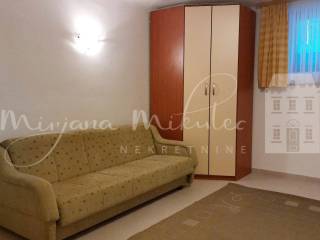 Ovaj kompaktan jednosobni stan u blagom suterenu sastoji se od prostrane sobe, potpuno opremljena kuhinje, hodnika te kupaonice.