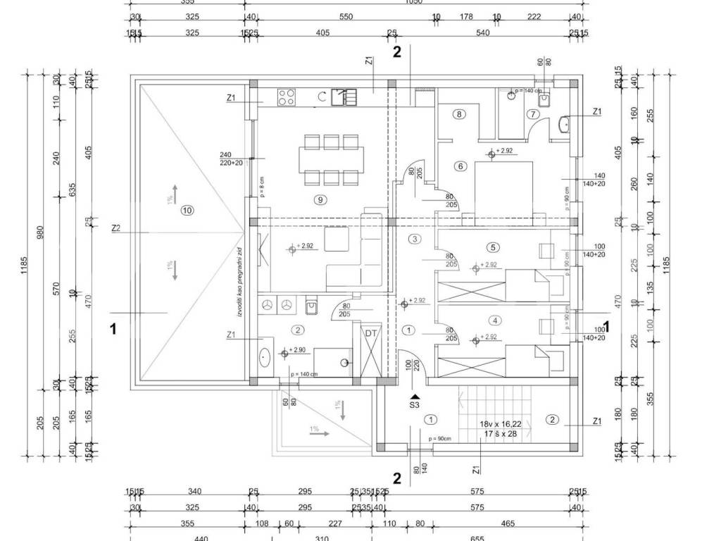 Projekt u fazi ishođenja građevinske dozvole, objekt sa tri stana, dva u prizemlju s vrtom i stan na prvom katu s velikom terasom i vrtom, svakom stanu pripadaju 2 parkirna mjesta.