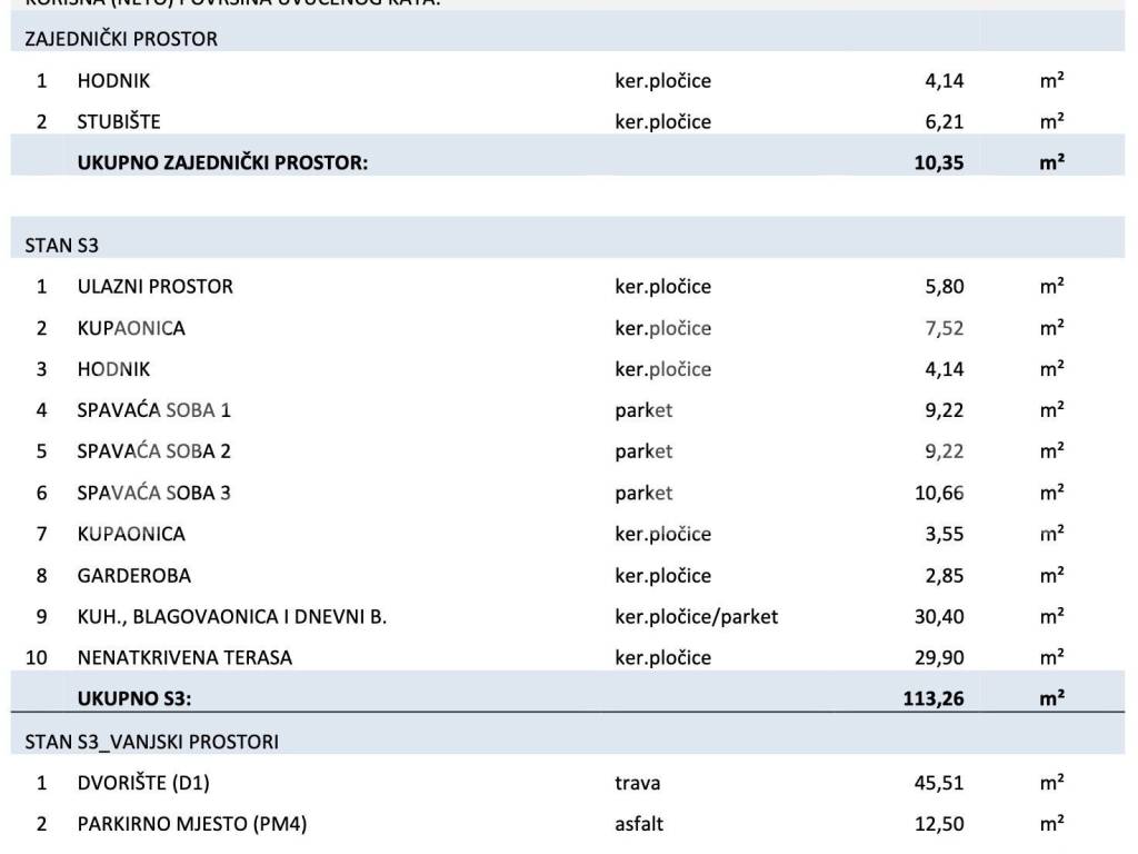 S3 - Dnevni boravak s kuhinjom i blagavaonicom, master spavaća soba s kupaonicom i garderobom, još dvije spavaće sobe, druga kupaonica, ukupne površine 83 m2 + terasa 30 m2 + vrt 45 m2 + 2 parkirna mjesta = 252.590 eura