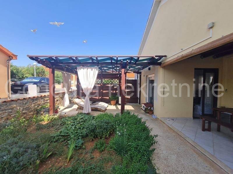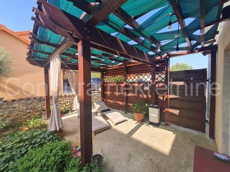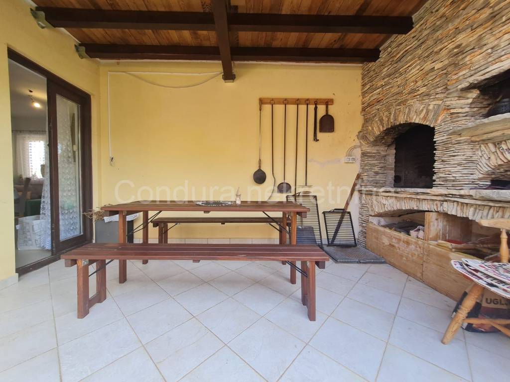 From the covered terrace with a beautiful stone barbecue, you can exit to a fenced garden with lots of greenery and a pergola ideal for relaxing and socializing.