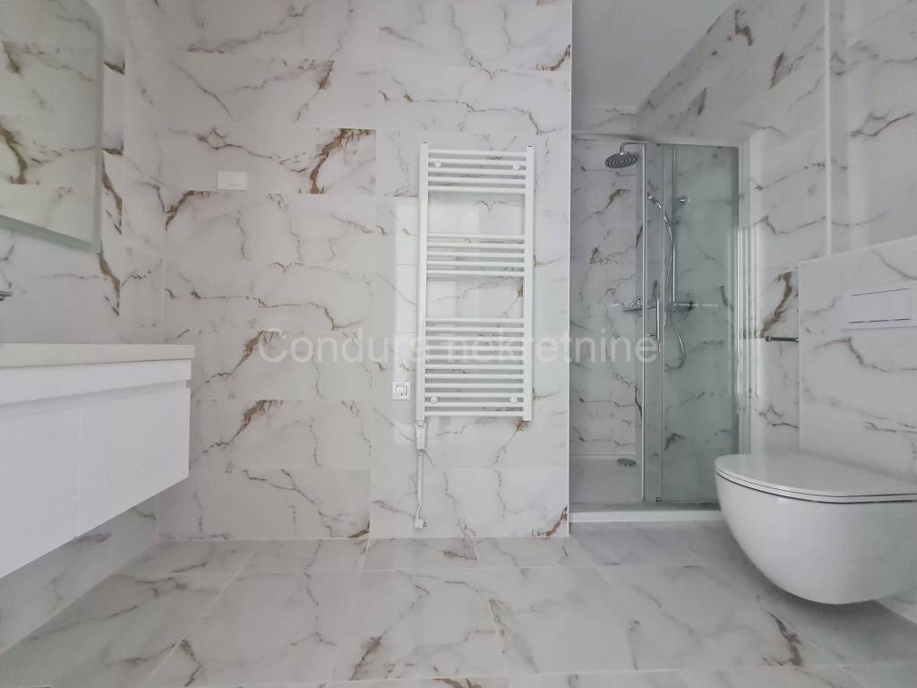 The apartment has an area of 152,48m2 and is spread over the first and second floor. In the lower part there is a hallway, one bedroom, a bathroom, a kitchen, a living room with a dining room and an exit to a covered terrace. An internal staircase leads from the lower part of the apartment to the second floor, where there is a large uncovered terrace (55 m2), a hallway, two bedrooms, each with its own bathroom and access to a spacious covered terrace.