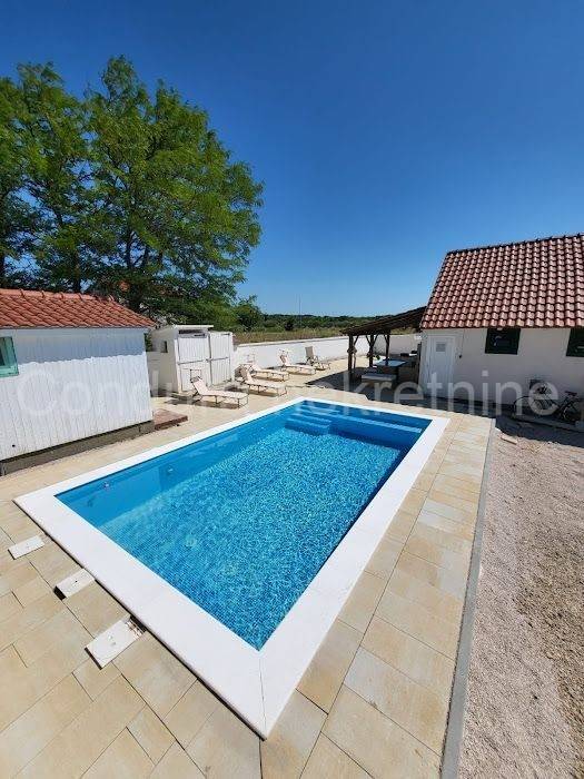 A vacation house with a swimming pool and a large yard is for sale. It is located in a quiet location surrounded by greenery, 400 m from the beach and the sea.