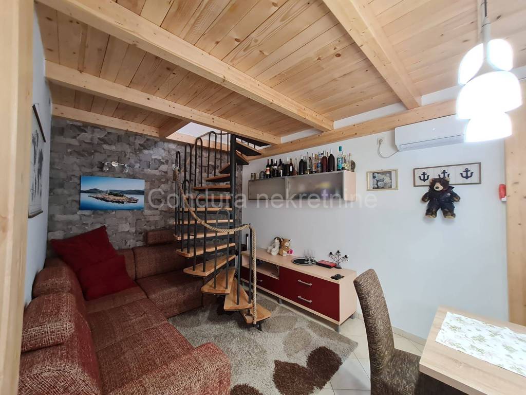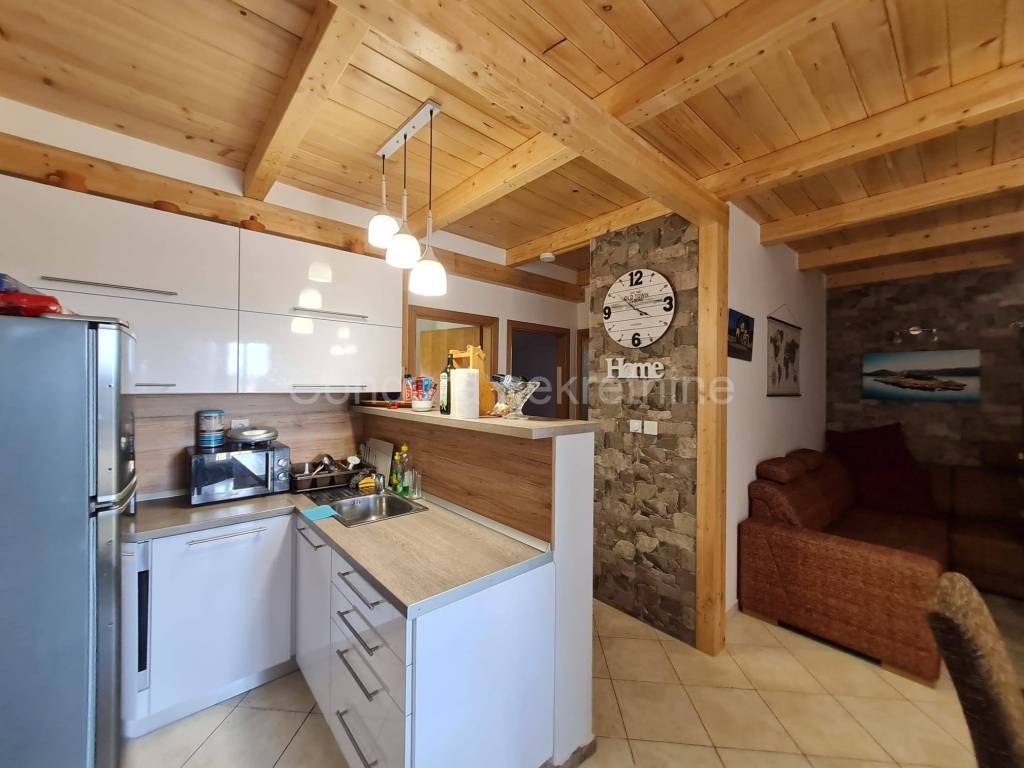 A two bedroom apartment with a net area of 48,63 m2 is for sale, located in the attic of a residential building. The apartment consists of a living room with a dining room and a kitchen, a bathroom, two bedrooms, a gallery and a terrace.