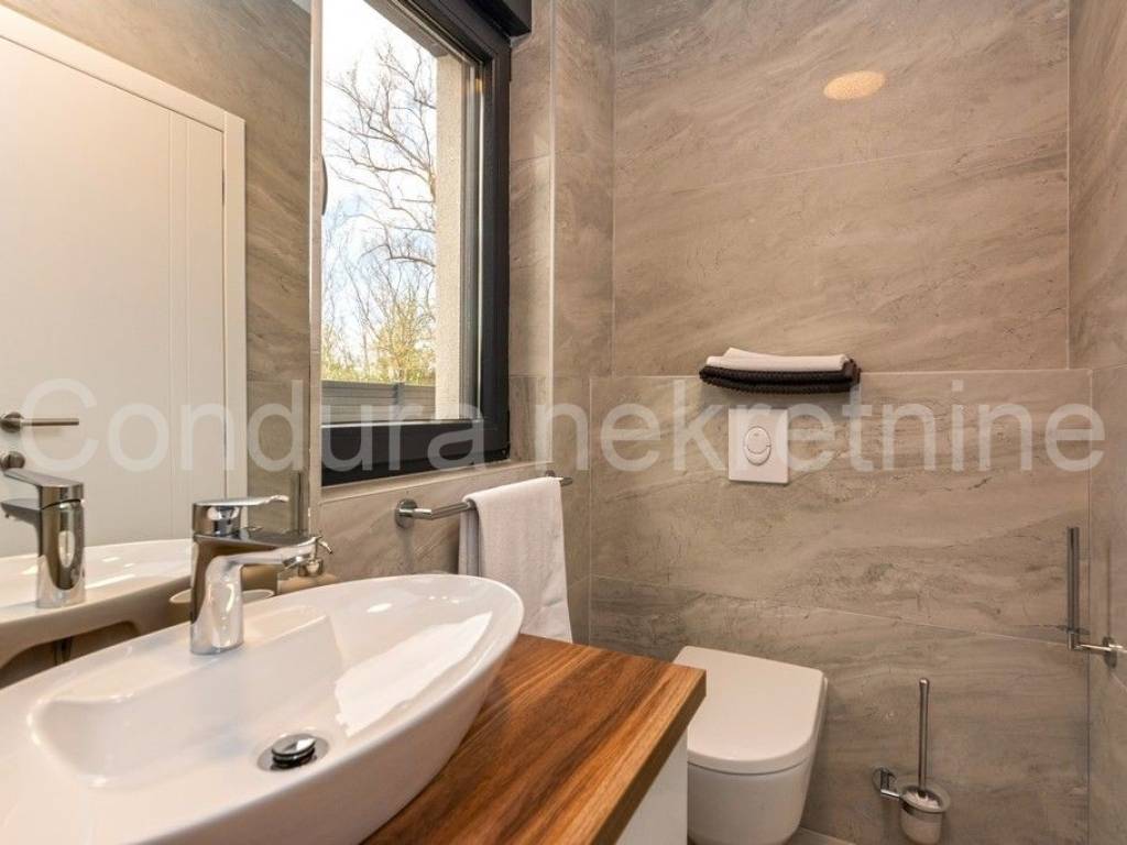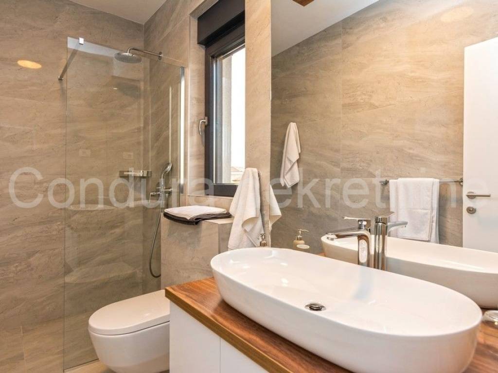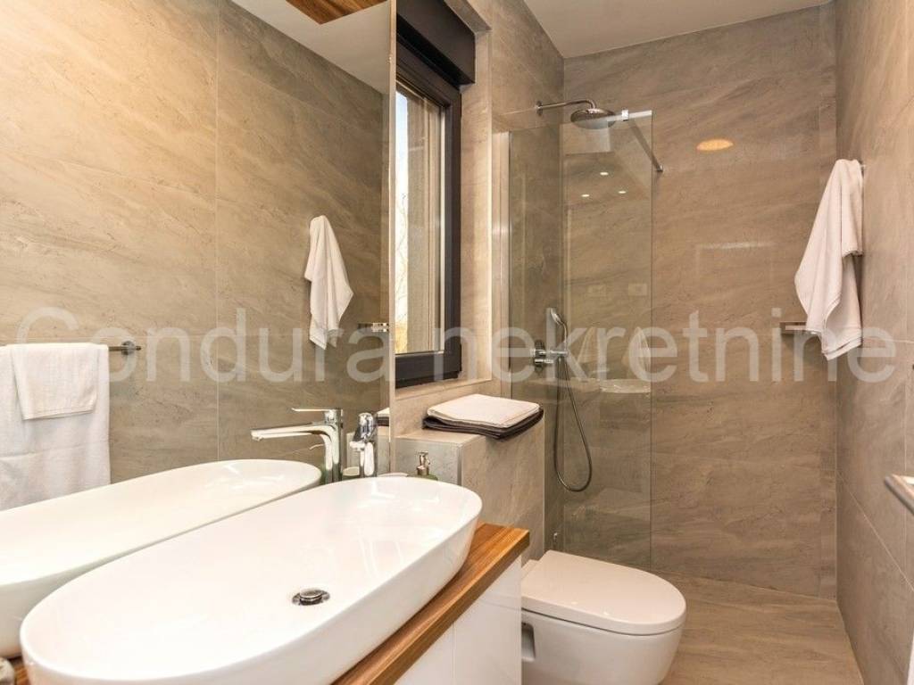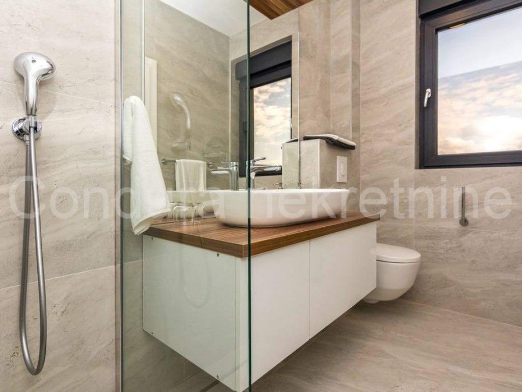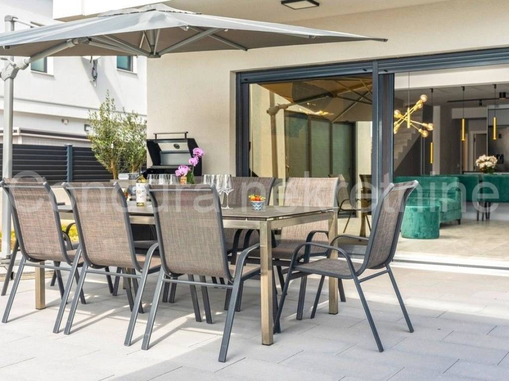 The house is fully furnished with first-class custom-made furniture. High quality floor coverings - ceramic tiles were used in the decoration, PVC joinery with electric shutters was installed. Air conditioning for heating and cooling in the living room and in each bedroom, and the bathrooms have underfloor heating.