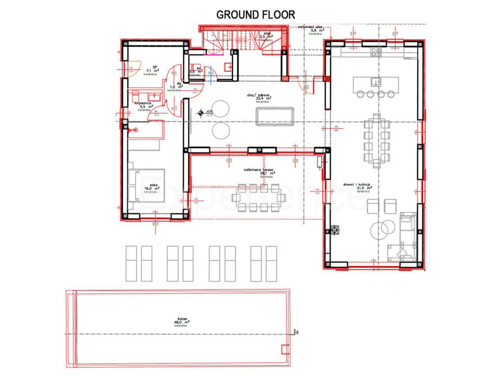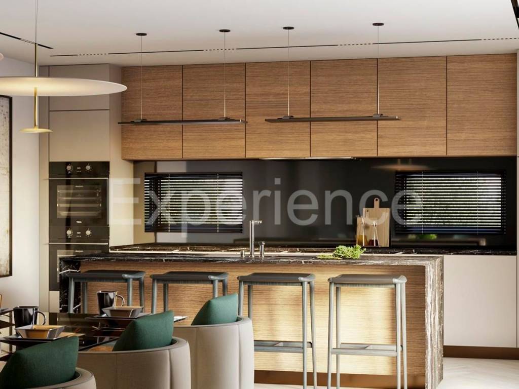On the ground floor there is a spacious living room (33.40 m) with access to the pool, a luxuriously designed open space that combines a modern kitchen, an elegant dining room and an additional living room with direct access to a covered terrace (28.10 m). This floor also contains a bedroom with an en-suite bathroom, a technical room, a laundry room and a guest toilet.