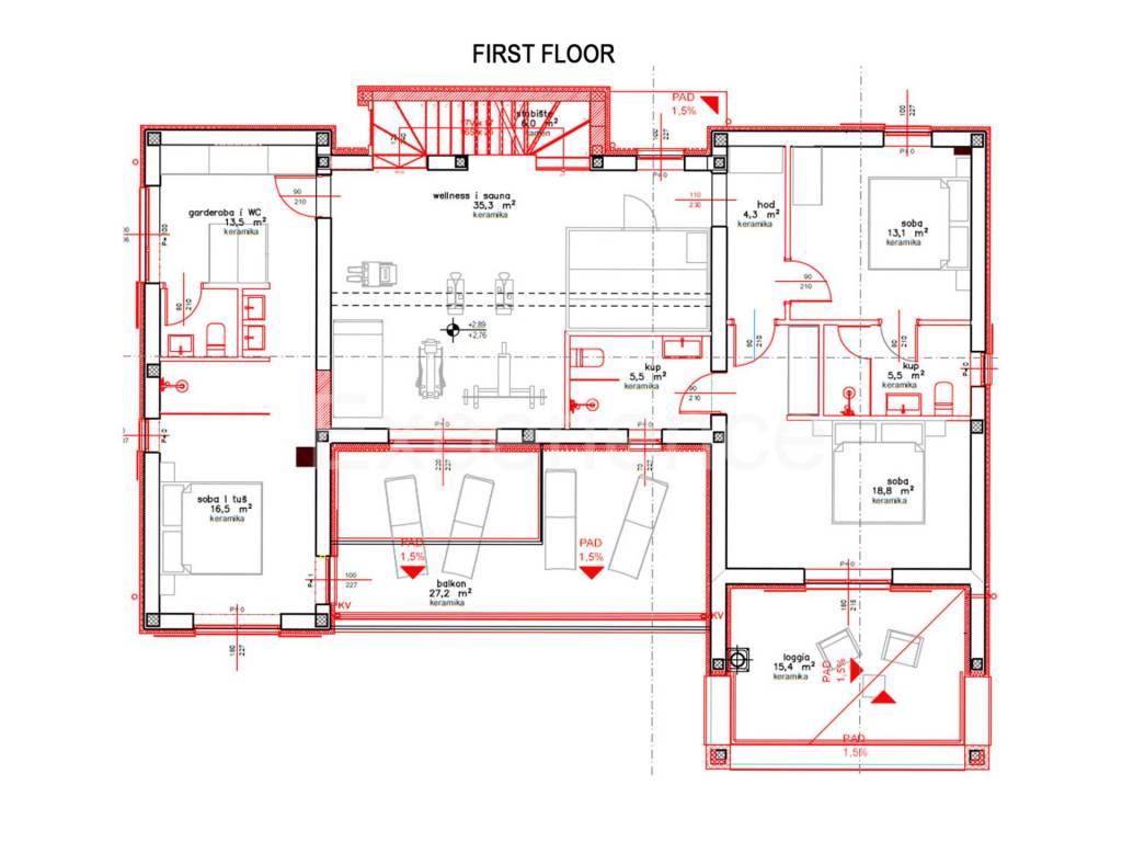 On the first floor there is a wellness area with a sauna, the perfect place to relax, three spacious bedrooms, each with its own bathroom and access to a balcony.