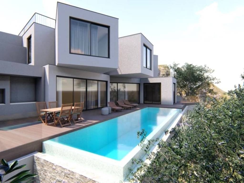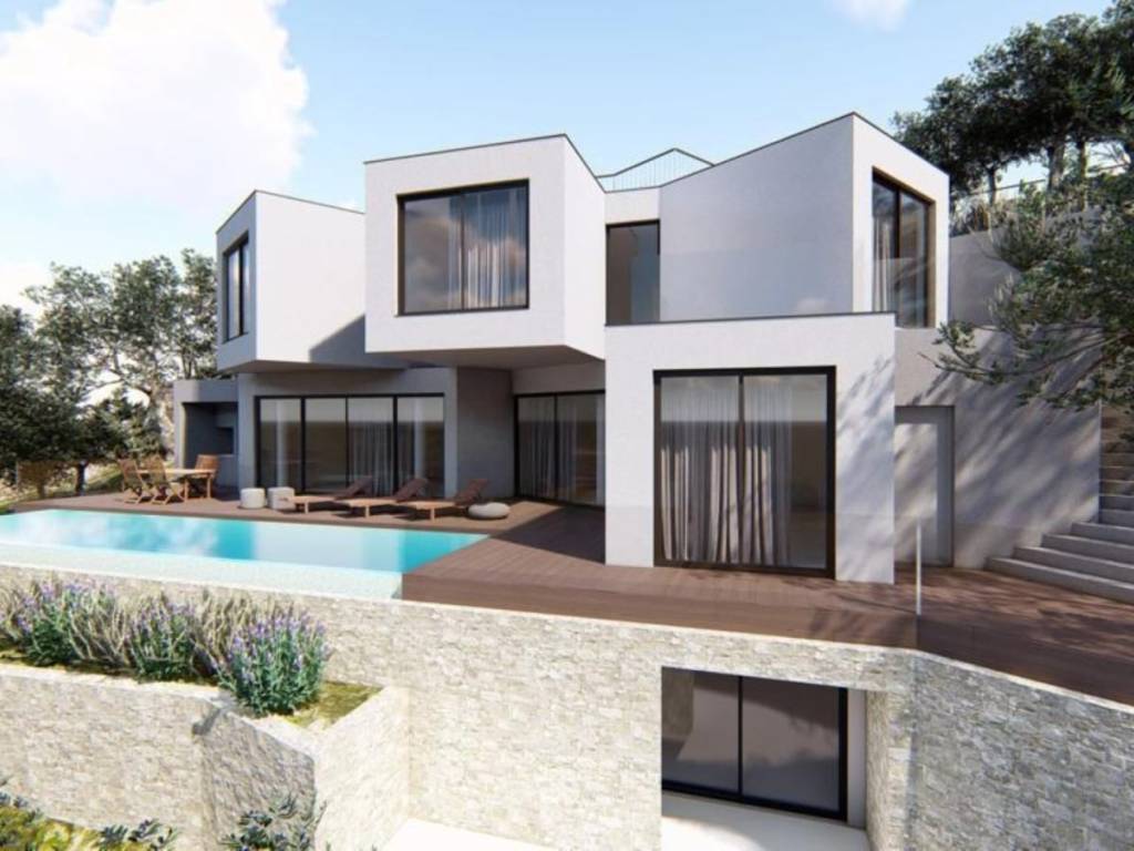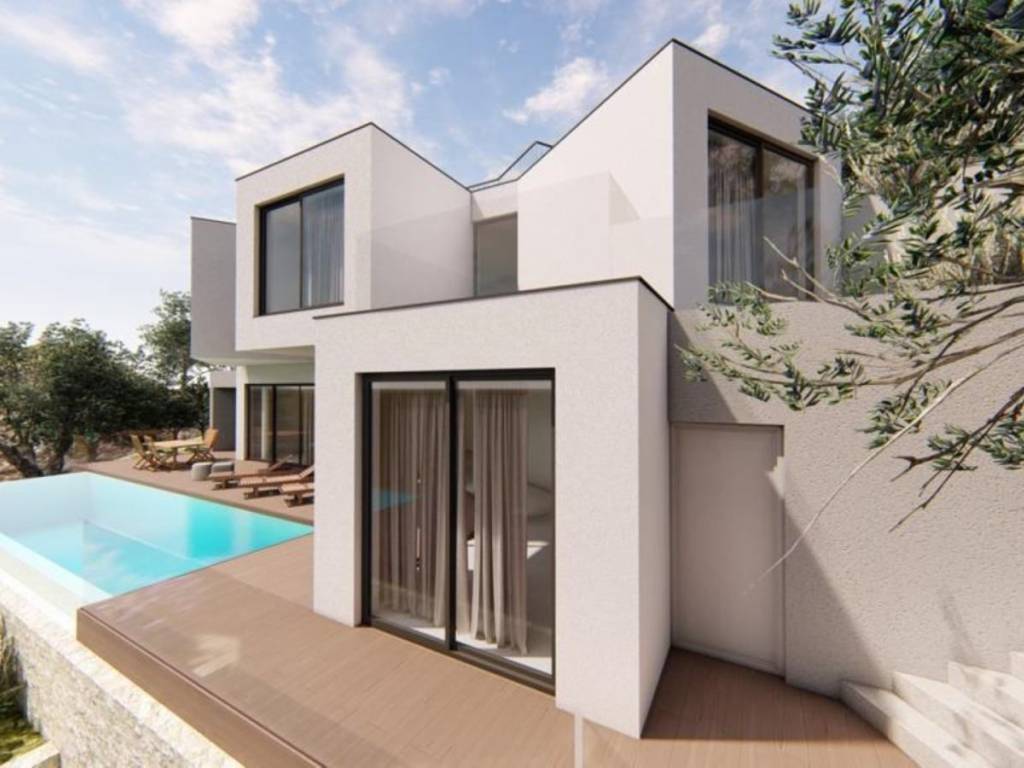 Građevinsko zemljište površine 411 m2, na mirnoj lokaciji cca 300 metara zračne udaljenosti od mora i plaže, Omiška rivijera, s pravomoćnom građevinskom dozvolom za vilu s bazenom ukupne površine 415 m2, može se početi s gradnjom odmah, prekrasan pogled na more i otoke, prilaz autom, priključci vode i struje pored zemljišta.