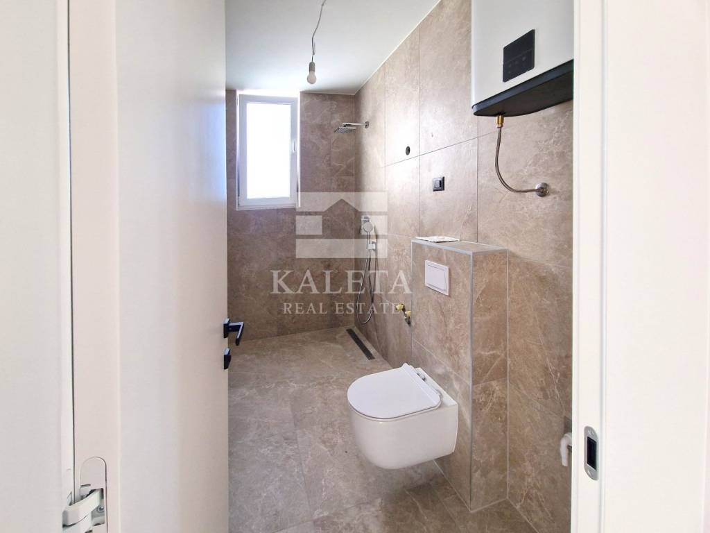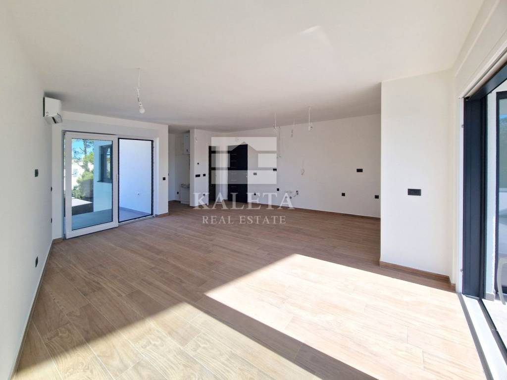 The 99 m² apartment is located on the 2nd floor of a newly built reinforced concrete building, currently in its final phase of construction. The apartment includes a large rooftop terrace of 99 m² with views of the sea and nature, two parking spaces, and a storage room. The building is also prepared for an electric vehicle charger next to the parking area.