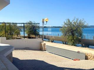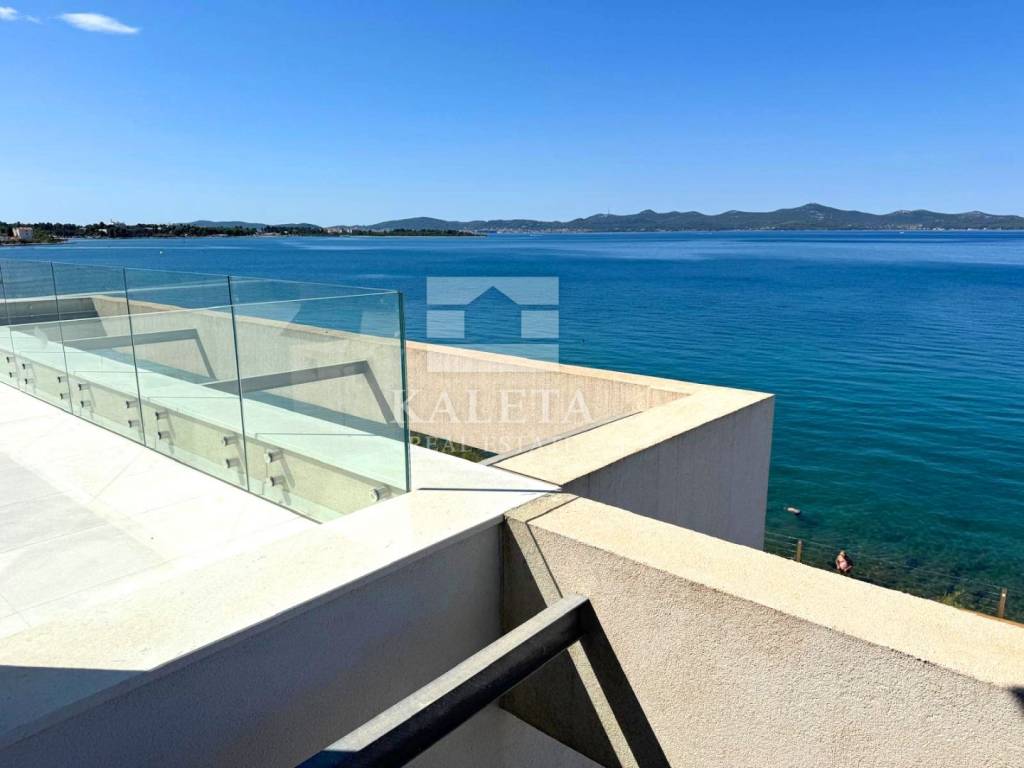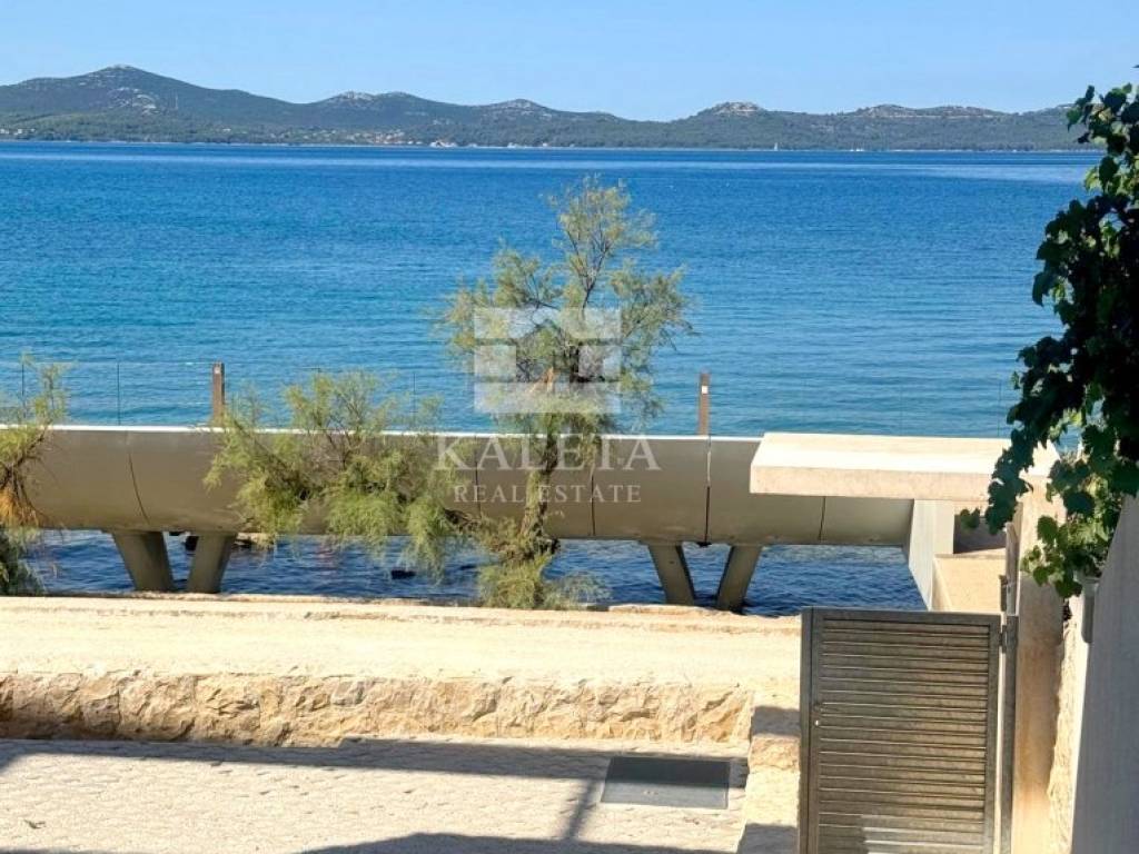 The first residential unit is two-story, with access to the yard. On the bright ground floor is a large open living room with kitchen and dining area, with access to the terrace through large glass walls offering a beautiful view of the sea and the beach. Next to the stairs to the first floor is the first bathroom, while upstairs there are two more bathrooms and three bedrooms, two of which have access to the terrace with an even better panoramic view of the Zadar channel.