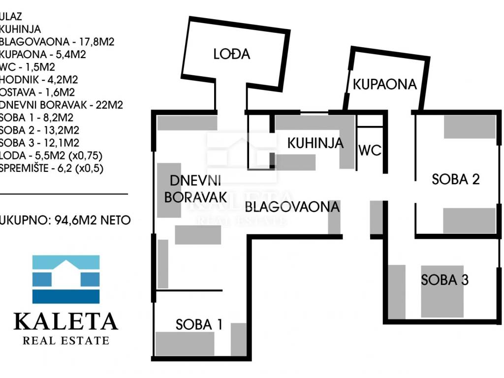 The apartment itself, excluding the loggia and storage room, has 87.3 m² and consists of a spacious and bright living room with access to a 5.5 m² loggia, a kitchen, pantry, bathroom, toilet, three bedrooms, and a hallway.