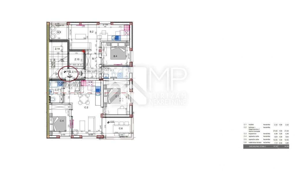 Apartment C with a total living area of 54.26 m² consists of: hallway: 2.32 m², kitchen with dining room and living room: 21.63 m², bathroom: 4.49 m², bedroom 1: 12.55 m², bedroom 2: 9.61 m², covered terrace: 3.66 m².