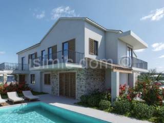 A family house with a swimming pool is for sale in the beautiful village of Jezera on Murter, close to a pebble beach. It is a charming terraced house designed in a beautiful Mediterranean stone style. House S1 consists of two floors with a total area of 141 m2, or a net usable area of 115.95 m2, including coefficients. The ground floor consists of a hallway, bathroom, bedroom and an open living room with kitchen and dining room with access to a spacious terrace with a sundeck, an outdoor pool of 23.76 m2. On the first floor there are two bedrooms (one with a terrace), a bathroom and a storage room. The house is superbly equipped: carpentry with mosquito nets and shutters, high-quality ceramic tiles, underfloor heating. The yard is completely fenced, and there is also a parking space for cars. The house is located in a beautiful quiet street only 680m from the pebble beach and 550m from the city center. The house will be ready for occupancy by summer 2026.