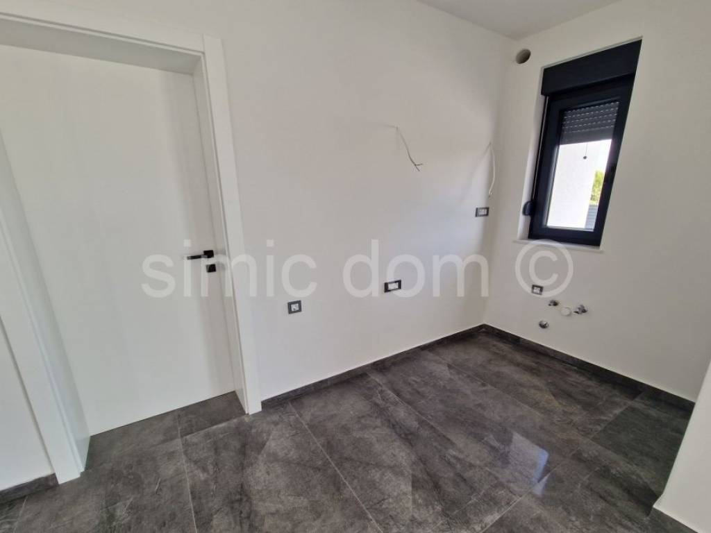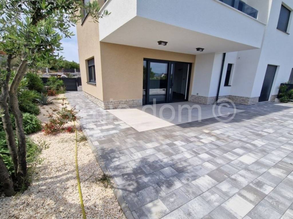 An attractive apartment placed on the ground floor of a new building completed in 2025, for sale in an attractive location in Murter. The building is only 300m from the beautiful pebble beach and the center itself. The apartment has a total net usable area of 79.28 m2 and stands out for its functional layout and spacious garden from which you can see the sea. It consists of a spacious living room with kitchen and dining room, two bedrooms, a bathroom, and the living area leads to a spacious paved terrace and a yard of 75 m2 with a beautiful view, ideal for enjoying summer evenings. It also has two outdoor parking spaces included in the price. The apartment is full of natural light, and the building is built to a very high quality and guarantees modern construction standards and top energy efficiency, confirmed by the energy certificate A. Security doors provide additional security, while underfloor heating and air conditioning are there for maximum comfort throughout the year. Since it is located in a great location close to all amenities, with a beautiful view and proximity to the sea, the apartment is excellent both for permanent residence and as an investment for tourist rentals. Ownership is in order.