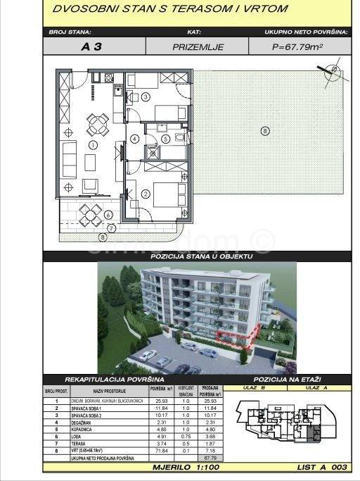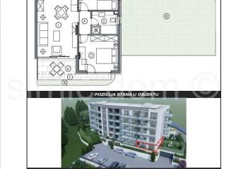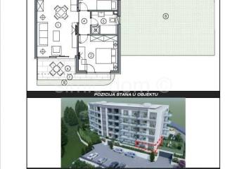 We mediate in the sale of a very attractive new building in an excellent location near the center of Makarska, under the highway. It is a ground floor apartment with an area of 67.79 m2, and the building offers four more upper floors. The apartment has two bedrooms, a bathroom, a dressing room, a spacious living room with a kitchen and dining room, a loggia, a terrace and a very large garden. The impressive and very functional design makes the apartment a modern property, full of light, and the high quality of workmanship (proven ceramics, carpentry, sanitary ware, insulation) guarantees longevity. For an additional fee of 15,000 for outdoor parking or 35,000 for a garage parking space, you also get a parking space. It is also possible to purchase a storage room located in the basement of the building. Since the investor is a legal entity, there is no obligation to pay 3% real estate tax. Ownership is in order.