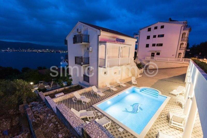 We are selling an apartment house, only 100 m away from the sea, district Okrug Donji on island of Ciovo. The total area of the house is 327 sqm and it is built in an extremely beautiful location, on a land sizing 678 sqm and consists of basement, ground floor, first floor and attic. The house consists of total 7 separate and furnished apartments. In the souterrain there is one one-bedroom apartment, while on the ground floor and first floor are two two-bedroom apartments, each with accommodation capacity for 5 people. In the attic there are two smaller one-bedroom apartments. The courtyard is completely decorated with outdoor facilities (barbecue, deck chairs and a heated pool of 32 sqm). From the terrace there is a beautiful sea view. The building has 7 parking spaces, it is fully air-conditioned, equipped and furnished. It is located close to the beach and all amenities.