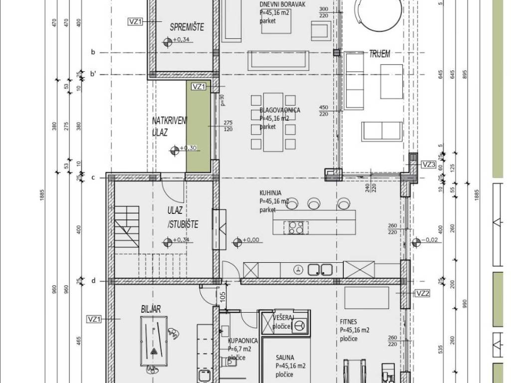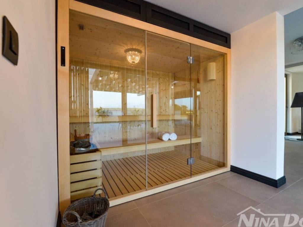 Ground floor: open-plan kitchen, living and dining area, bathroom, laundry room, storage, fitness, sauna, game room