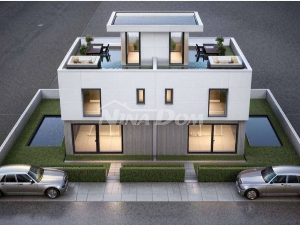 Prizemlja: terase, kuhinje s dnevnim boravkom, kupaona, unutarnje stepenice za kat,: na katu tri spavaće sobe, dvije kupaonice unutarnje stepenice za veliku krovnu terasu s izlazom i natkrivenim dijelom krovne terase. Okućnica s parkirnim mjestima i bazenom