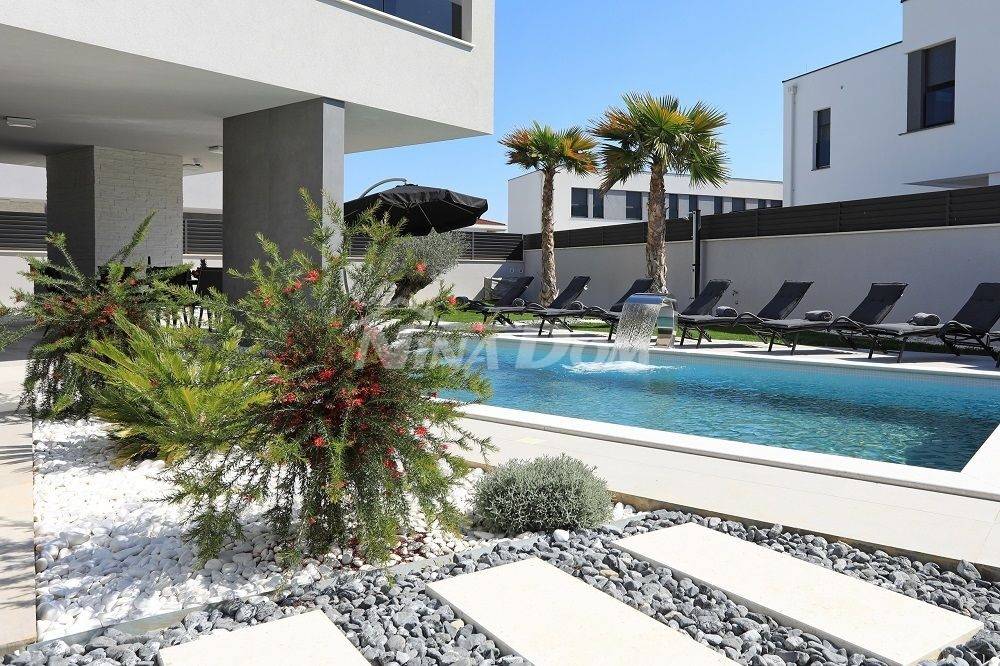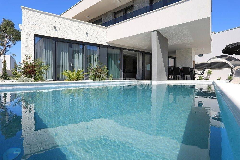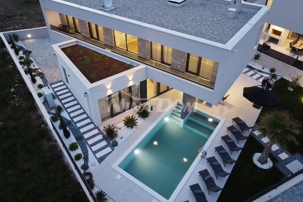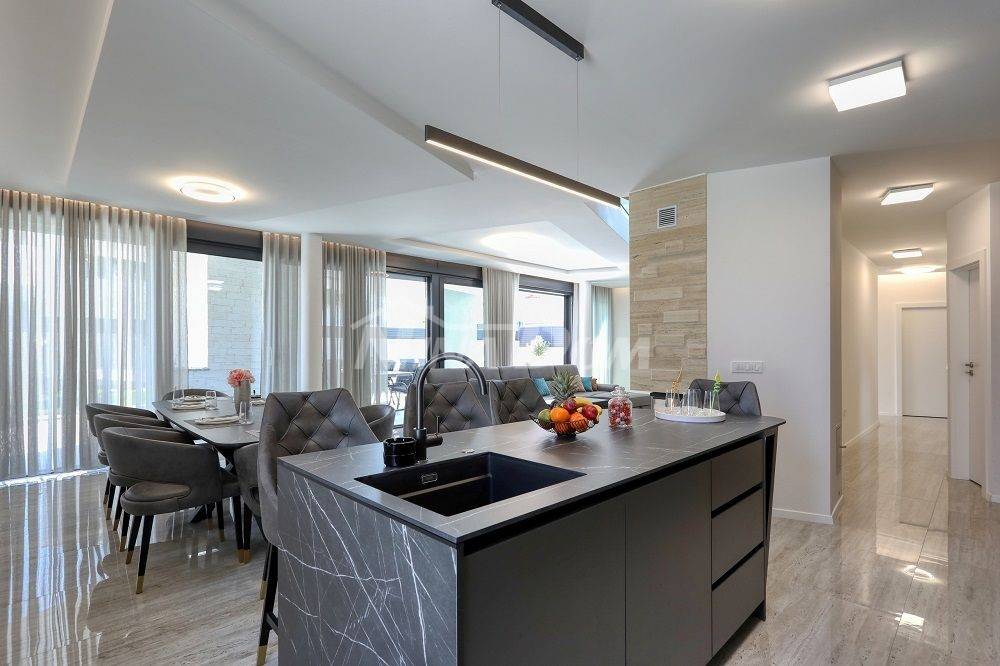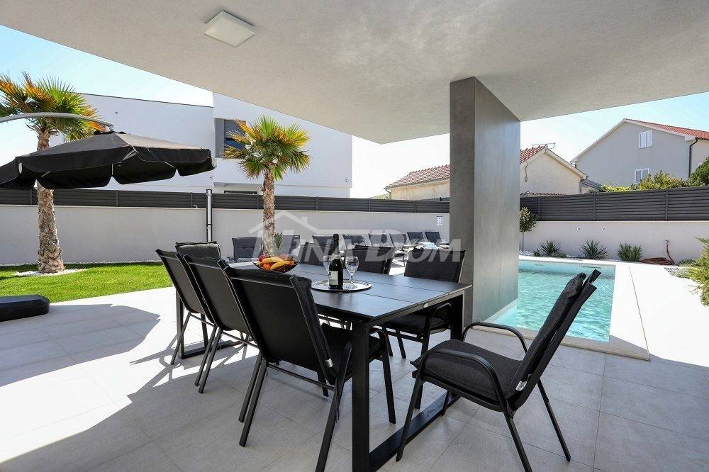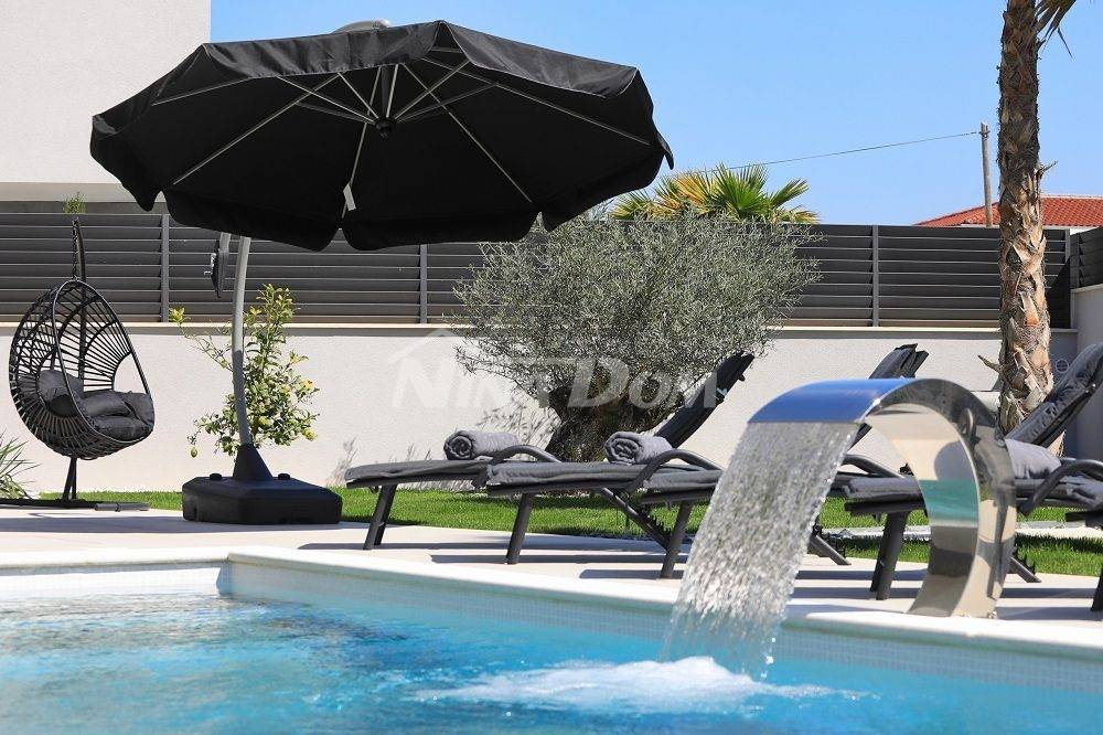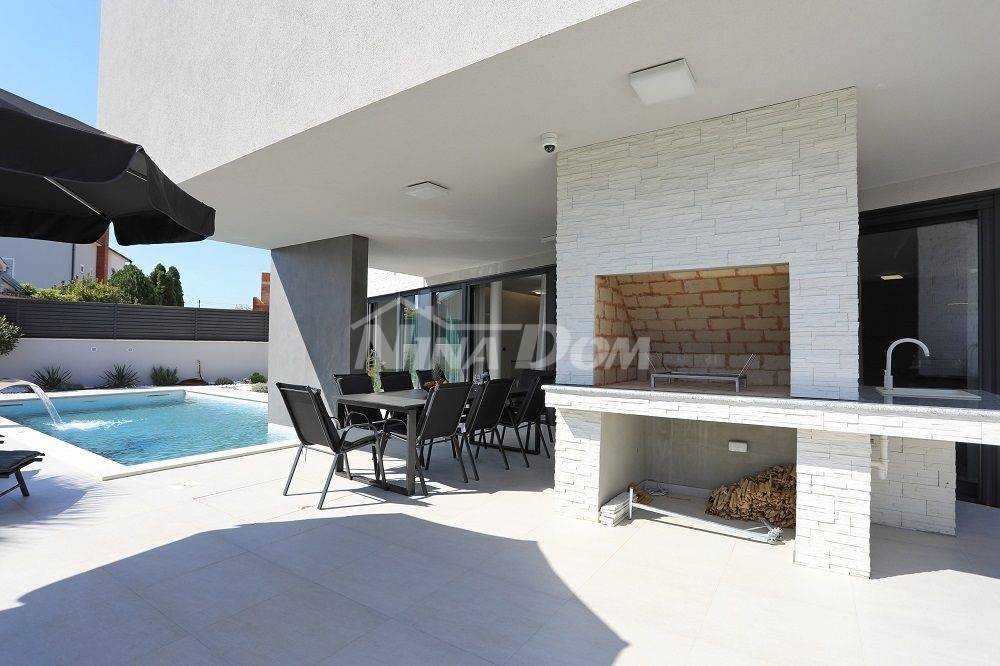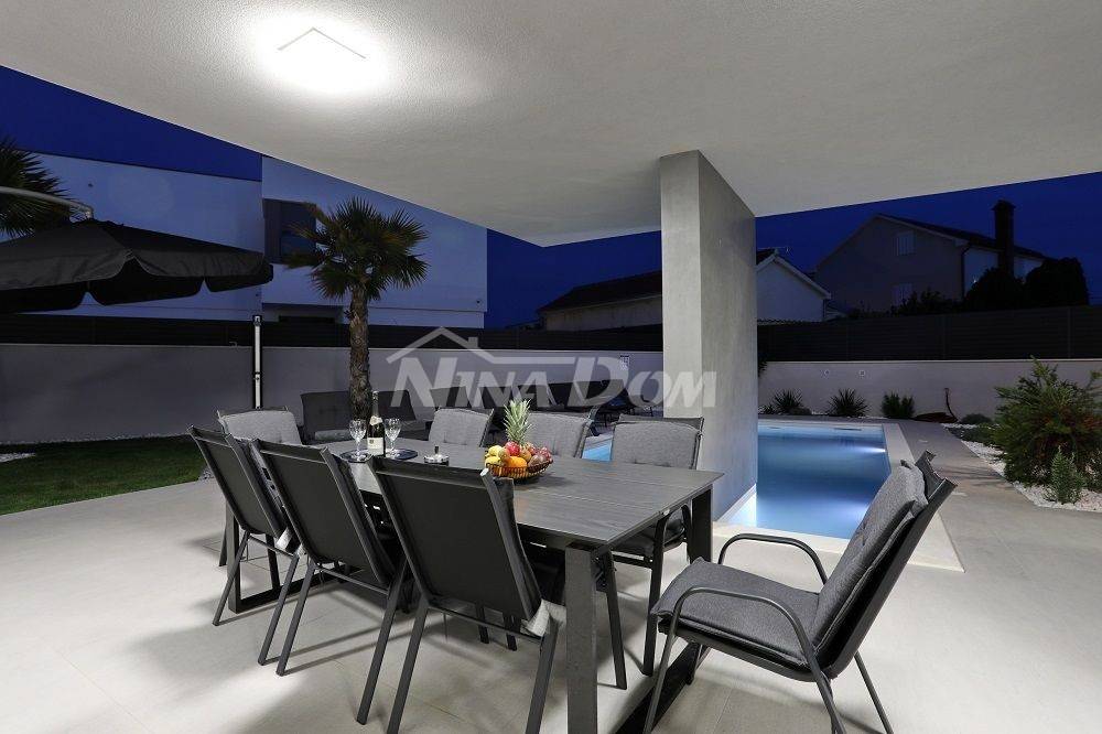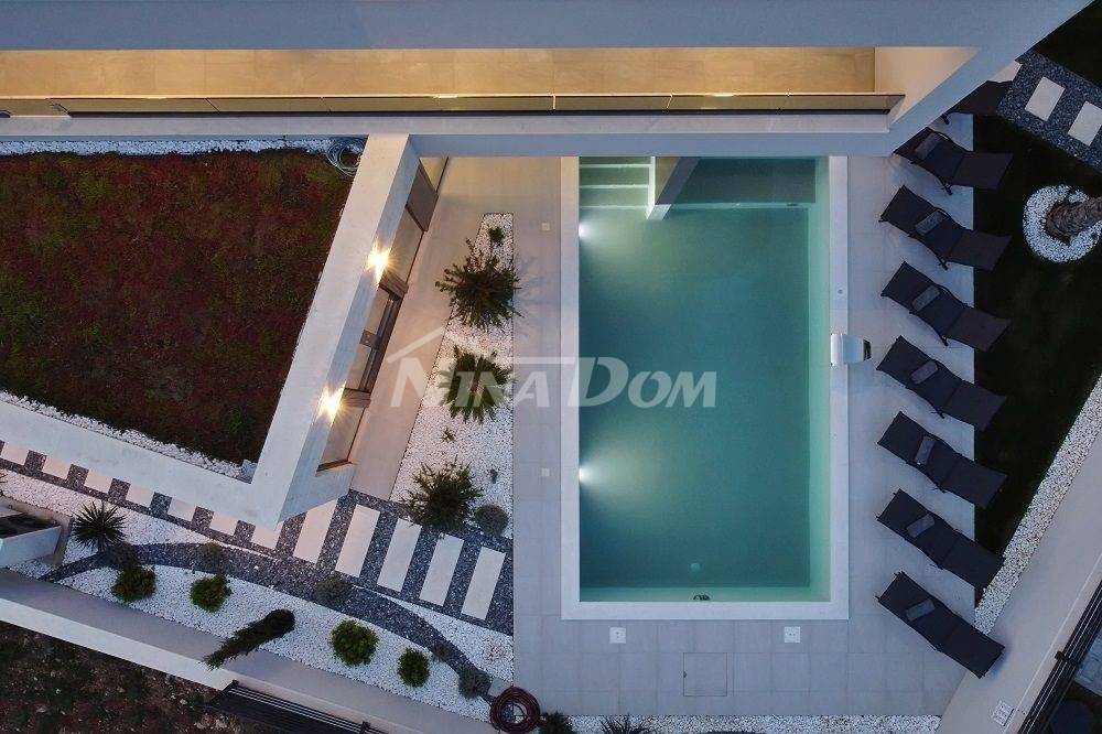 Okućnica uređena prostena 512 m2, u unutarnjem dijelu dvorišta smješten je bazen od 30 m2 s dizalicom topline i prostor za druženje s roštiljem.
