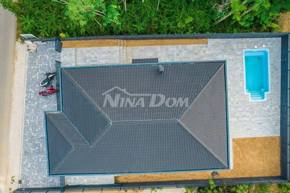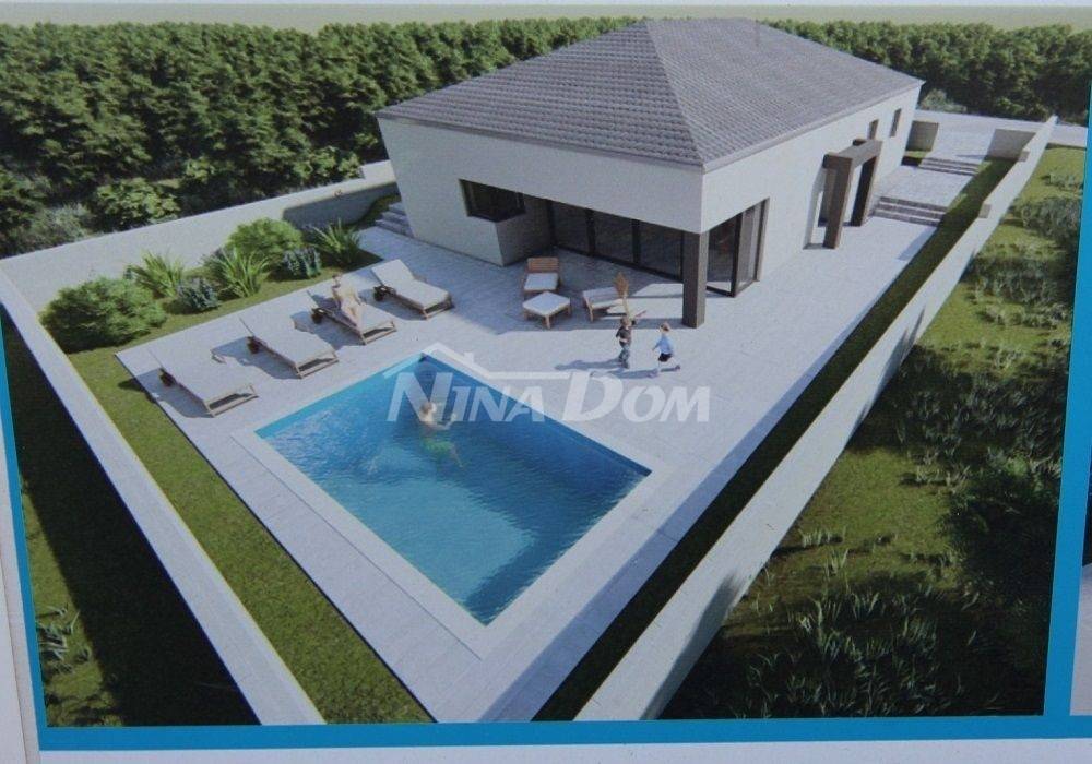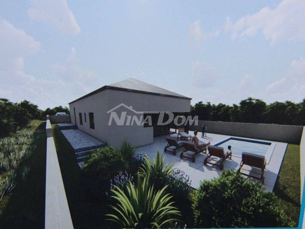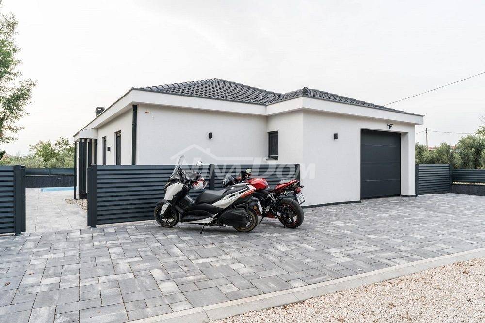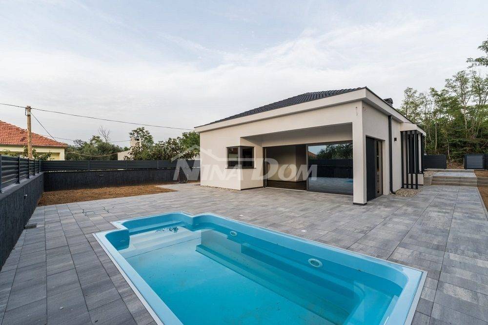 Novogradnja, prizemnica s bazenom. Izgrađena na 502 m2 zemljišta u mirnom dijelu Privlake okružena s zelenilom.