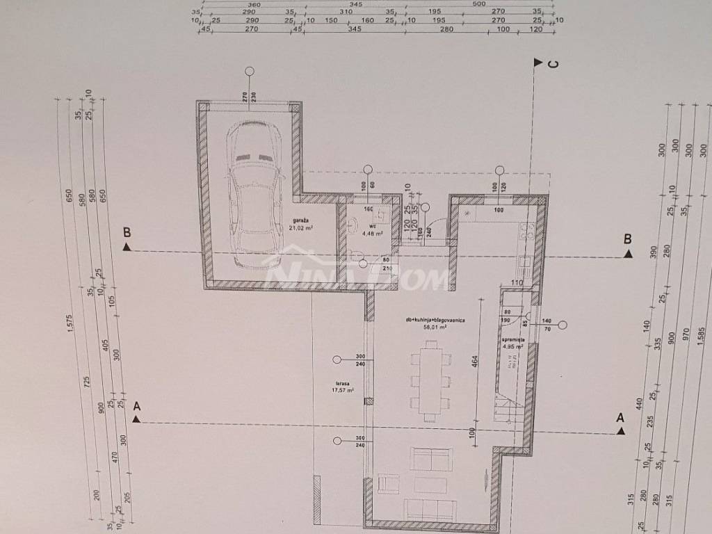 sastoji se od prizemlja: kuhinja/blagovaonica, dnevni boravak, wc, spremište, garaža, natkrivena terasa. 106.02 m2