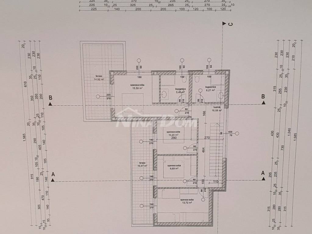 Kat: unutarnje stepenice, 4 spavaće sobe, dvije kupaone, hodnik, natkrivena i ne natkrivena terasa. 108.28 m2.