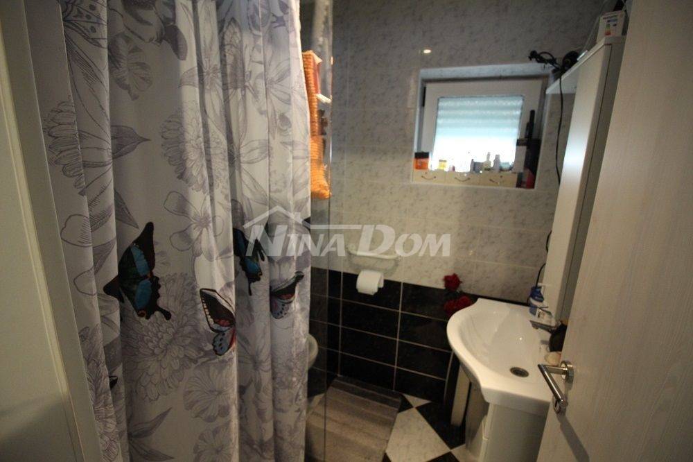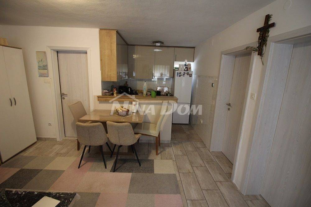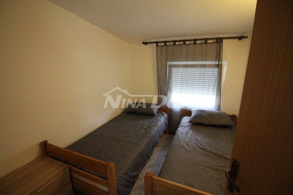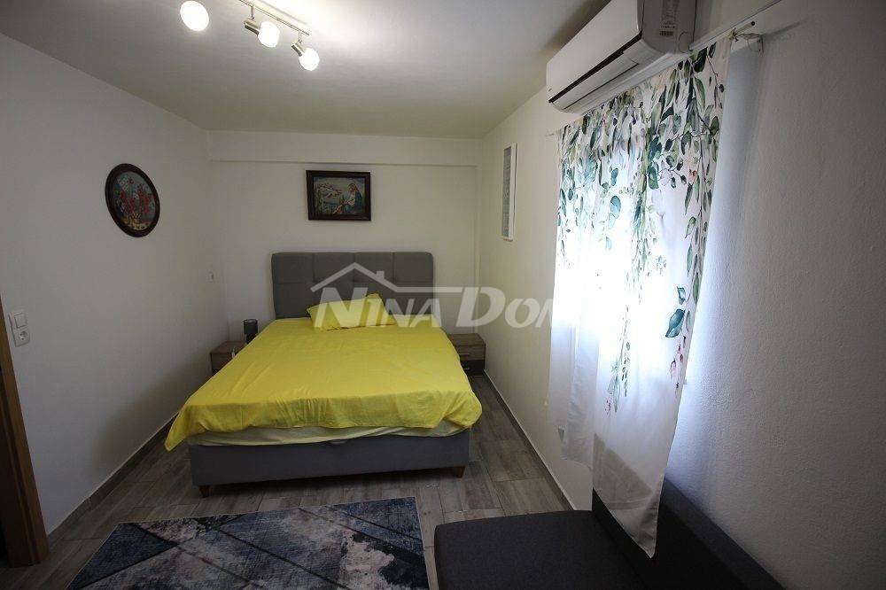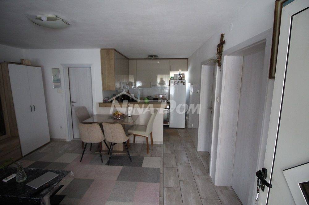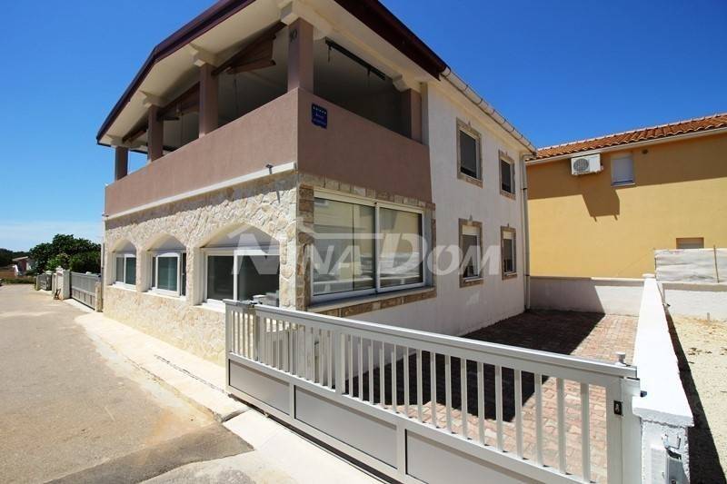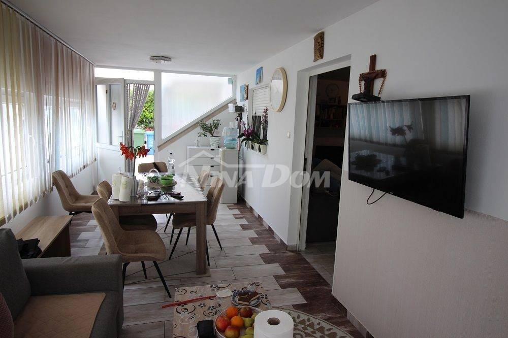 Samostojeća kuća na kat. Prizemlje: apartman koji ima dvije spavaće sobe, kuhinju s dnevnim boravkom, kupaonu i terasu s duplom garažom. Na katu apartman s dvije spavaće sobe, kuhinju s dnevnim boravkom, kupaonu i terasu i jedan apartman s jednom spavaćom sobom, kuhinja s dnevnim boravkom, kupaona i terasa. Nekretnina je lijepo uređena, kompletno opremljen i kao takva se prodaje. Okućnica uređena prostrana s dosta zelenila i sjenicom za ugodno druženje. Od mora je udaljena 300 metara.