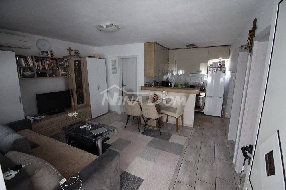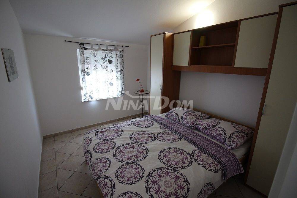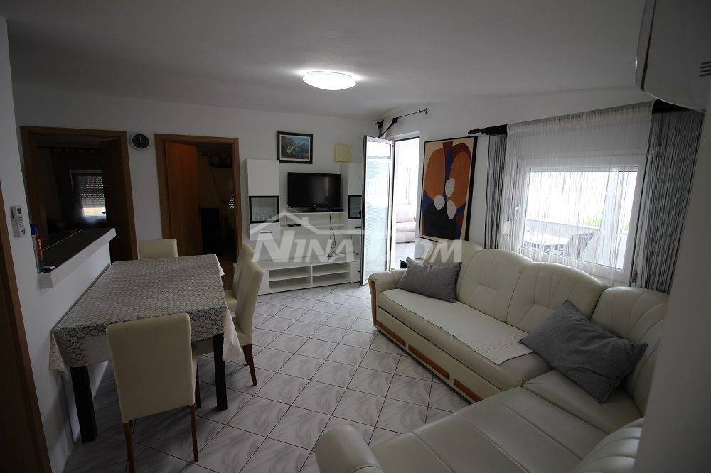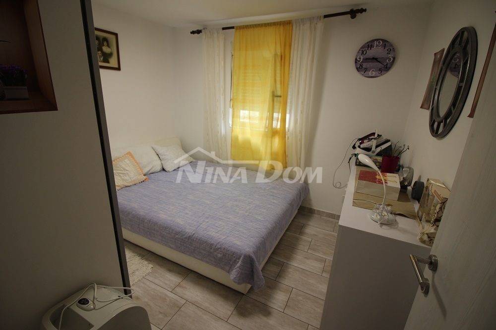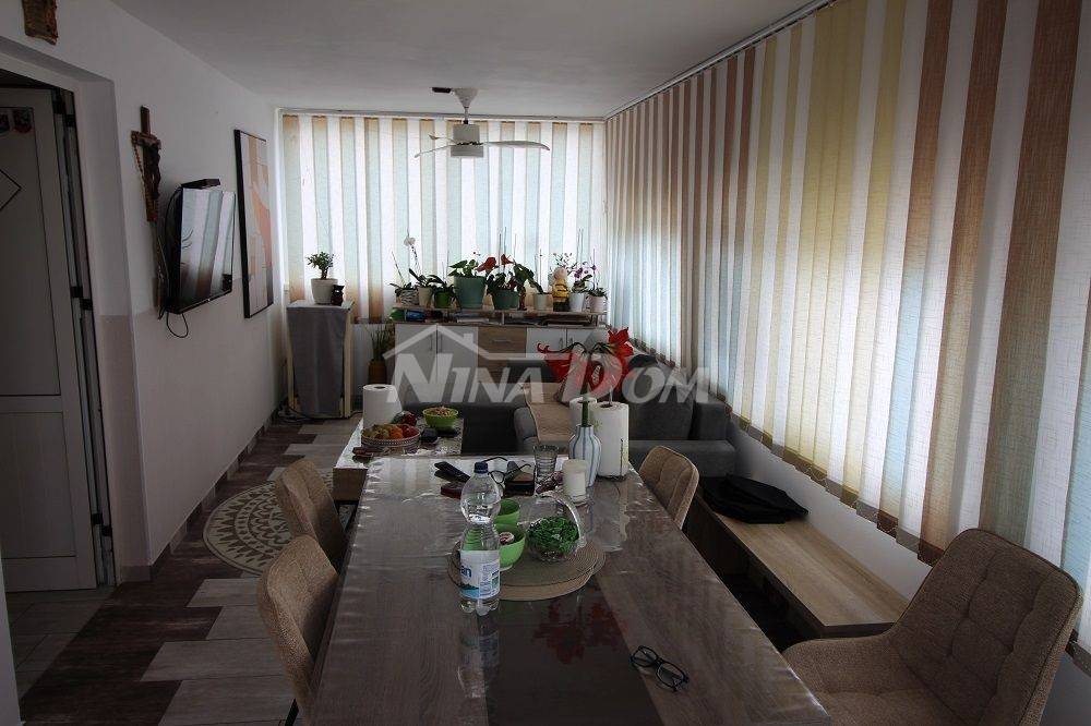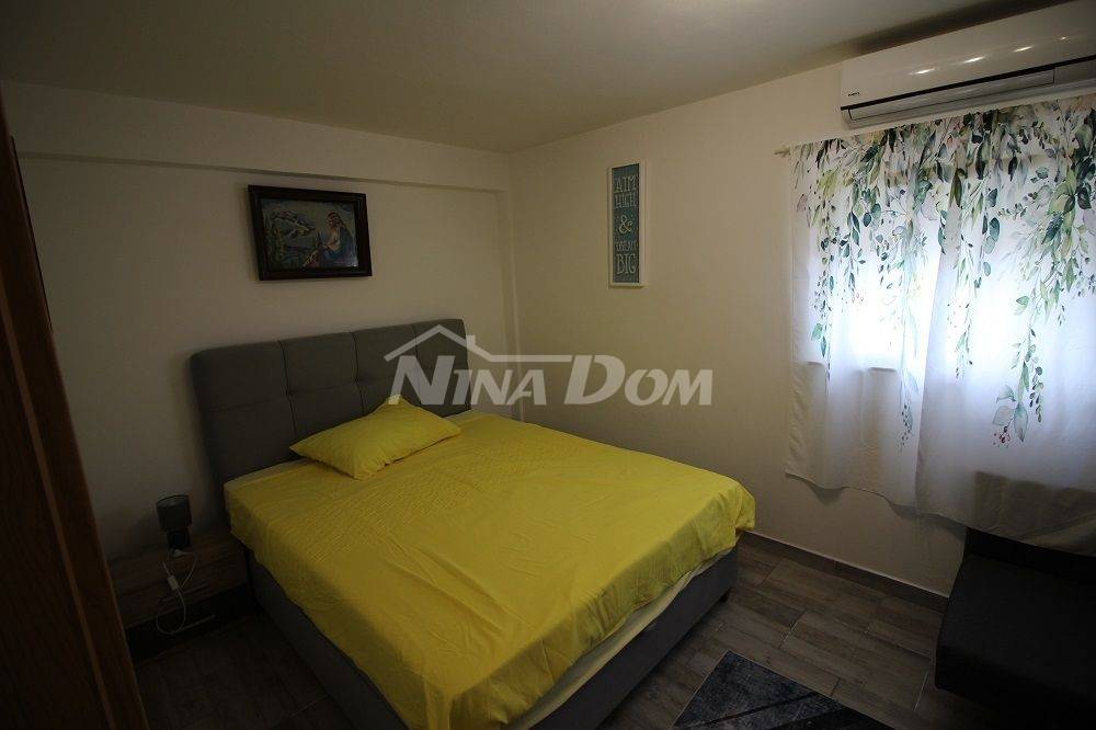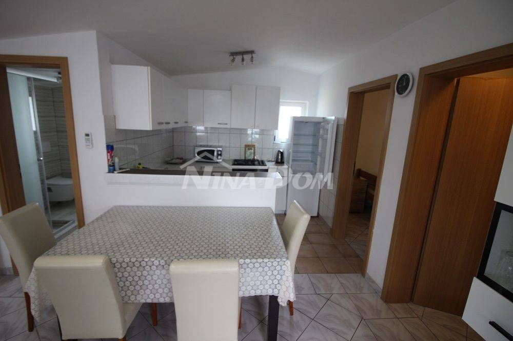 Samostojeća kuća na kat. Prizemlje: apartman koji ima dvije spavaće sobe, kuhinju s dnevnim boravkom, kupaonu i terasu s duplom garažom. Na katu apartman s dvije spavaće sobe, kuhinju s dnevnim boravkom, kupaonu i terasu i jedan apartman s jednom spavaćom sobom, kuhinja s dnevnim boravkom, kupaona i terasa. Nekretnina je lijepo uređena, kompletno opremljen i kao takva se prodaje. Okućnica uređena prostrana s dosta zelenila i sjenicom za ugodno druženje. Od mora je udaljena 300 metara.