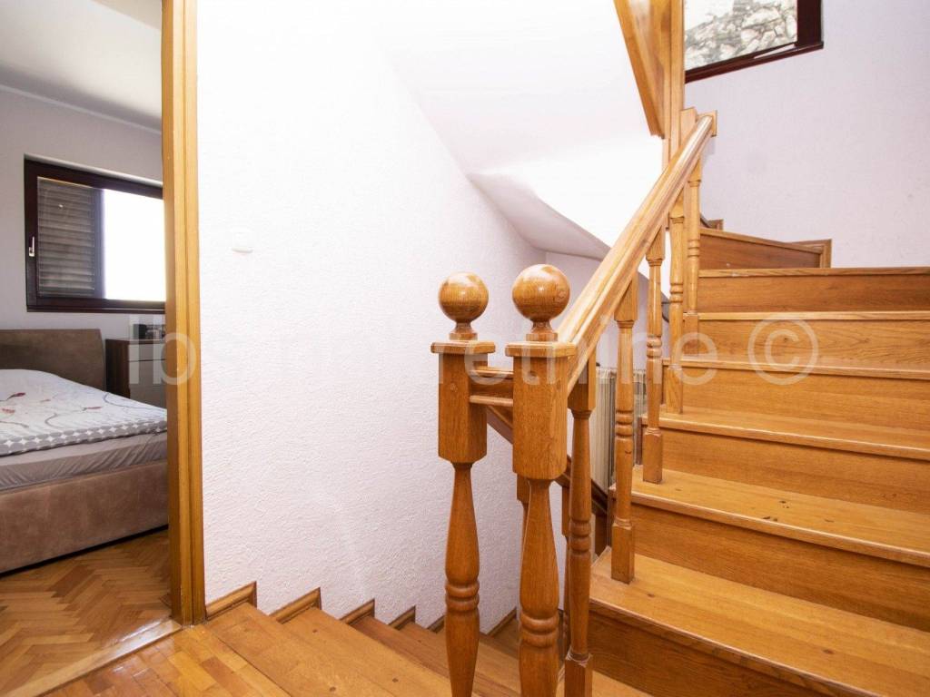 Kuća je u dobrom stanju, sa prostranim unutarnjim prostorom koji pruža udoban život. Sastoji se od dvije etaže, sa 4 prostrane spavaće sobe, 3 moderne kupaonice, velikim dnevnim boravkom te kuhinjom i blagovaonicom. Dodatni sadržaji uključuju, ostavu i terasu koja nudi predivan pogled na grad i more.