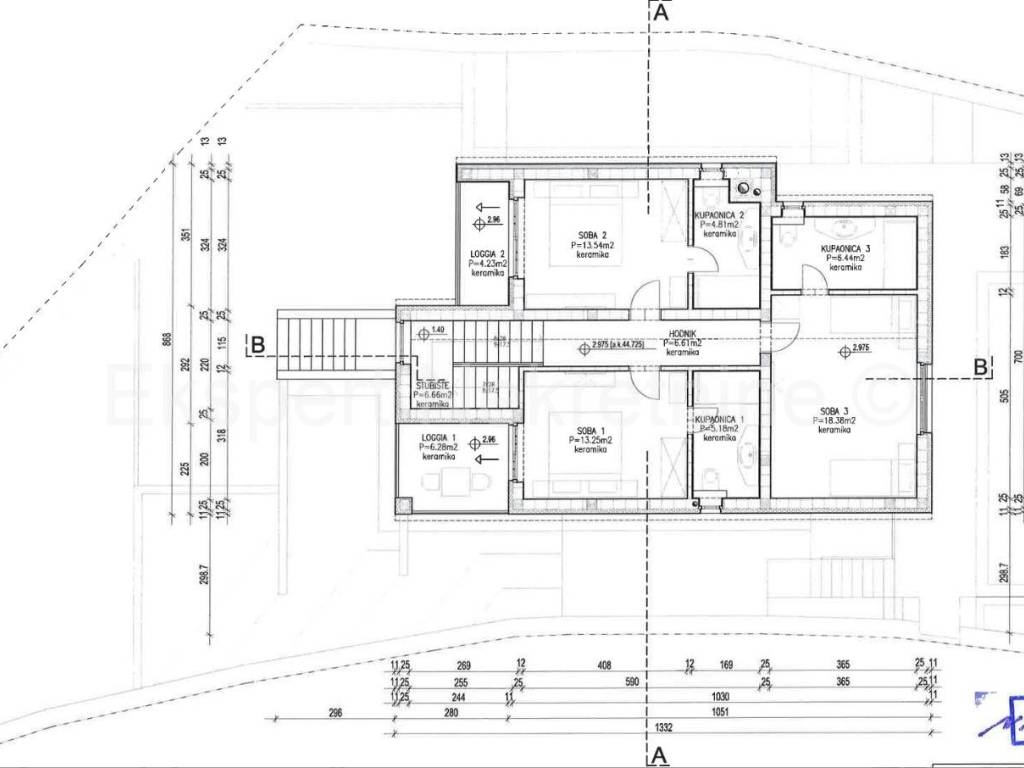 On the first floor there are 3 rooms, 3 bathrooms, a corridor, an internal staircase and two loggias.