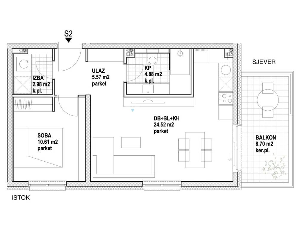 Stan se sastoji od dnevnog boravka s kuhinjom i blagovaonicom, spavaće sobe, kupaonice s wc-om, izbe, ulaznog hodnika i balkona.
