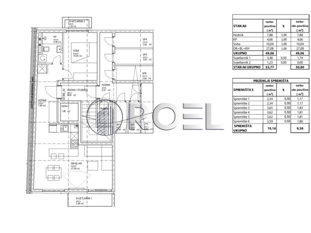 The apartment is located in the basement/second part of the apartment on the ground floor, and consists of an entrance hall (7.88 m2), bathroom (4.06 m2), rooms (10.04 m2), living room, kitchen and dining room (27.08 m2), skylight 1 (3.48 m2), skylight 2 (1.23 m2), storage room (2-4 m2 optional), and a parking space of 12.50 m2.