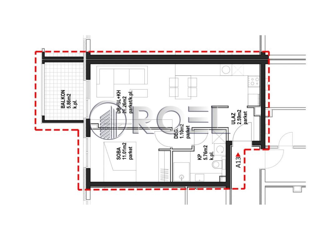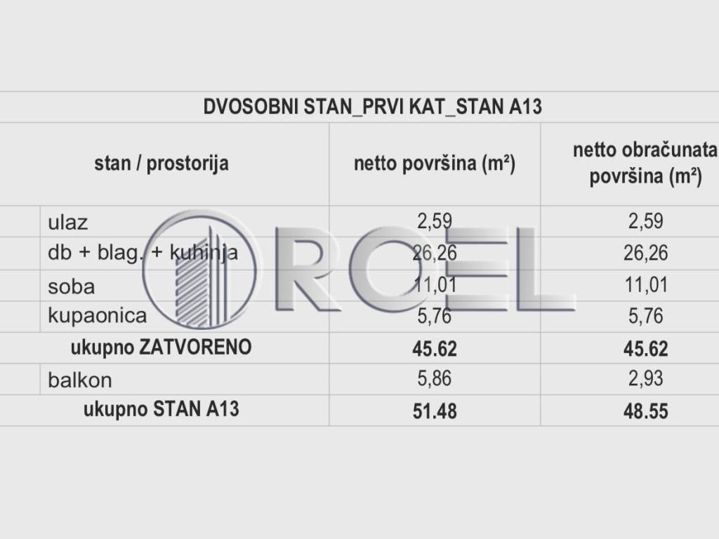 Moderan dvosobni stan ( A23 i B16) nalazi se na prvom katu novogradnje od ukupno tri kata u Stenjevcu, NKP 52,87 m2. Sastoji se od ulaza, dnevnog boravka s kuhinjom i blagovaonom s izlazom na balkon veličine, spavaće sobe te kupaonice s wc-om. Uz stan dolazi spremište površine 3,46m2. Pod je obložen parketom i keramikom. U stanu je podno grijanje.Uz stan dolazi spremište površine 4m2 i GPM površine 17,40m2 ( 8,7m2).