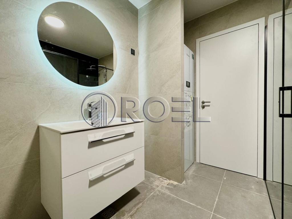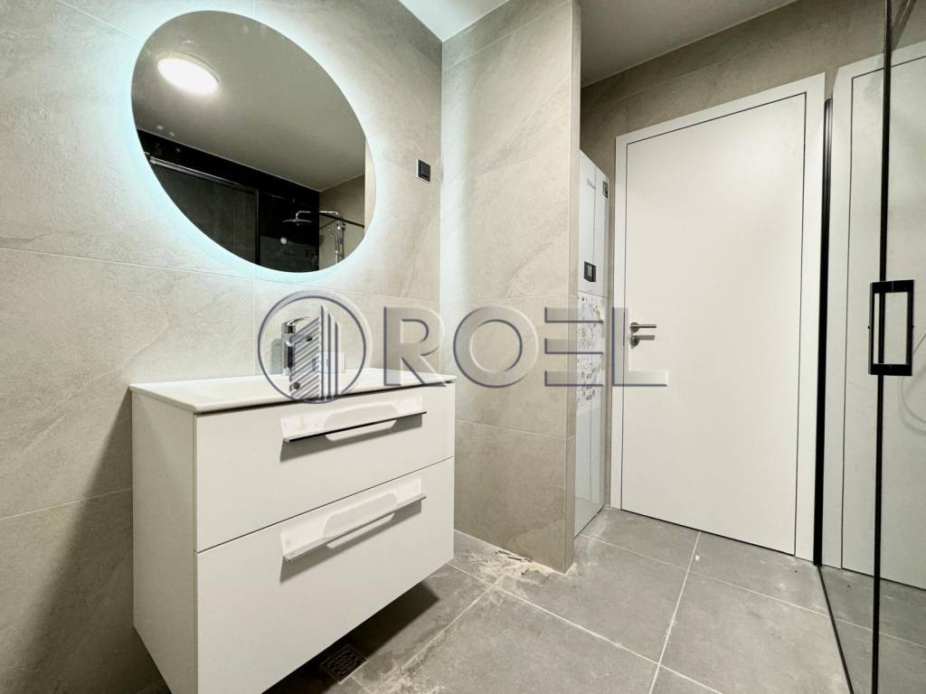 Kupaonica ima već ugrađeni umivaonik i ogledalo te ostale sanitarije ronomiranih proizvođača, a dizalice topline smještene su u ugradbenim ormarima u hodniku s ogledalom koji tkđ. dolaze uz stan.