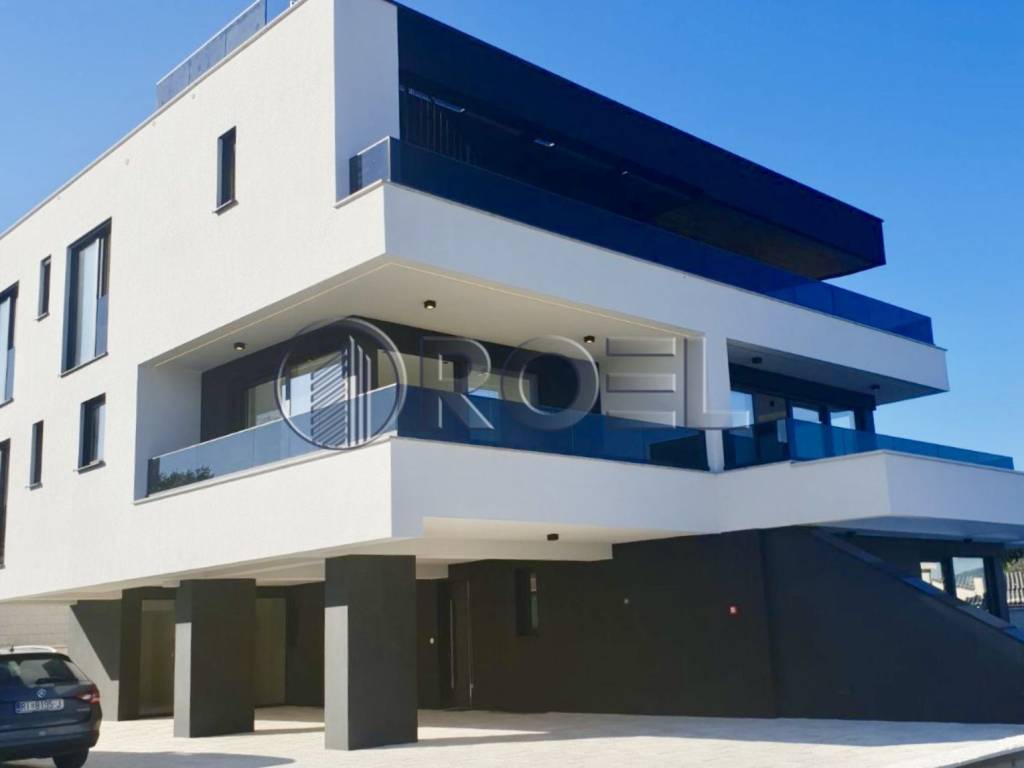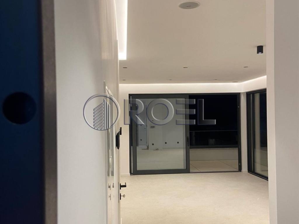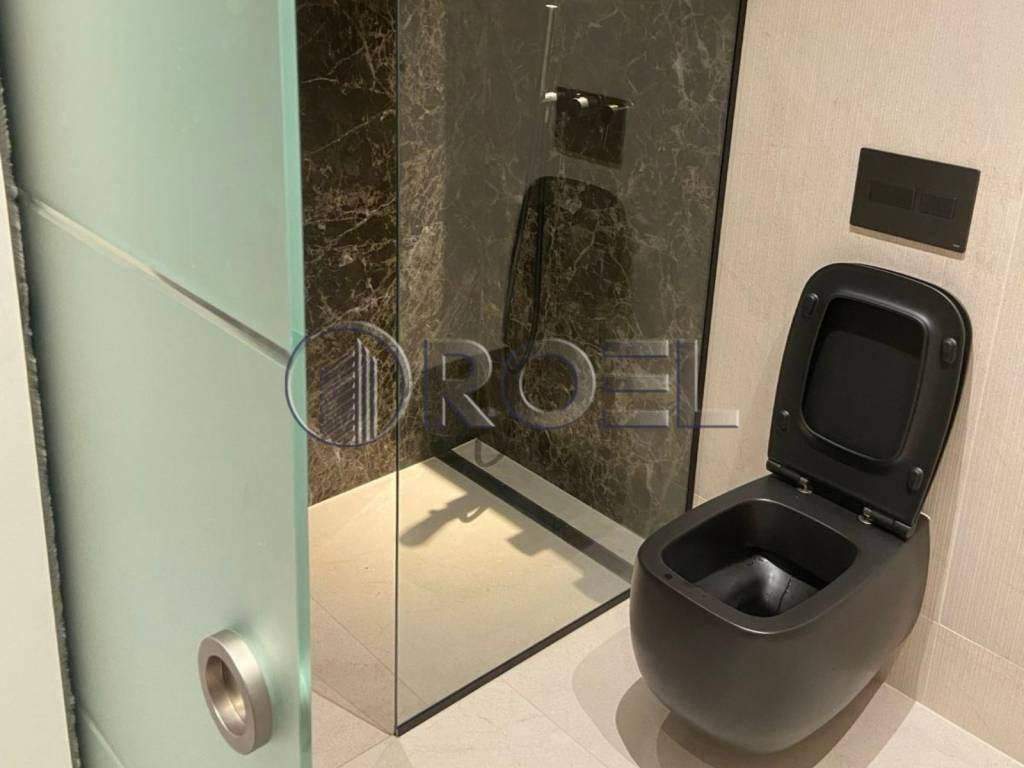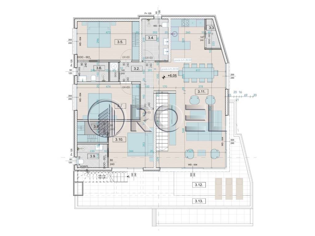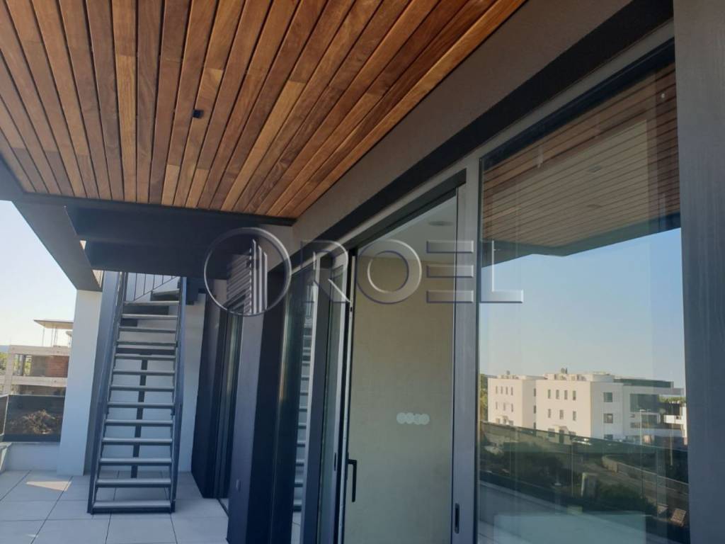 The apartment consists of an entrance hall, three bedrooms, three bathrooms, a wardrobe, a kitchen with a dining room and a living room, a covered balcony, an uncovered balcony and a spacious roof terrace.