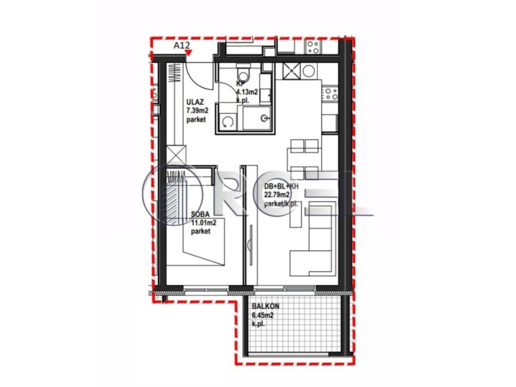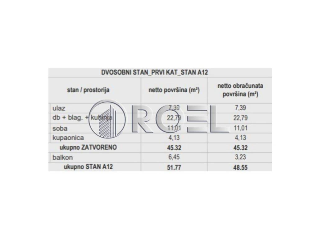 Moderan dvosobni stan (A12) nalazi se na prvom katu novogradnje od ukupno tri kata u Stenjevcu, NKP 51,92 m2. Sastoji se od d ulaznog prostora, kupaonice, sobe i dnevnog boravka s kuhinjom i blagovaonicom površine 44,76 m2 s balkonom površine 7,16 m2 , ukupne površine 51,92 m2 kojem pripada spremište u podrumu oznake SPR 20 površine 4,25 m2. Pod je obložen parketom i keramikom. U stanu je podno grijanje.
